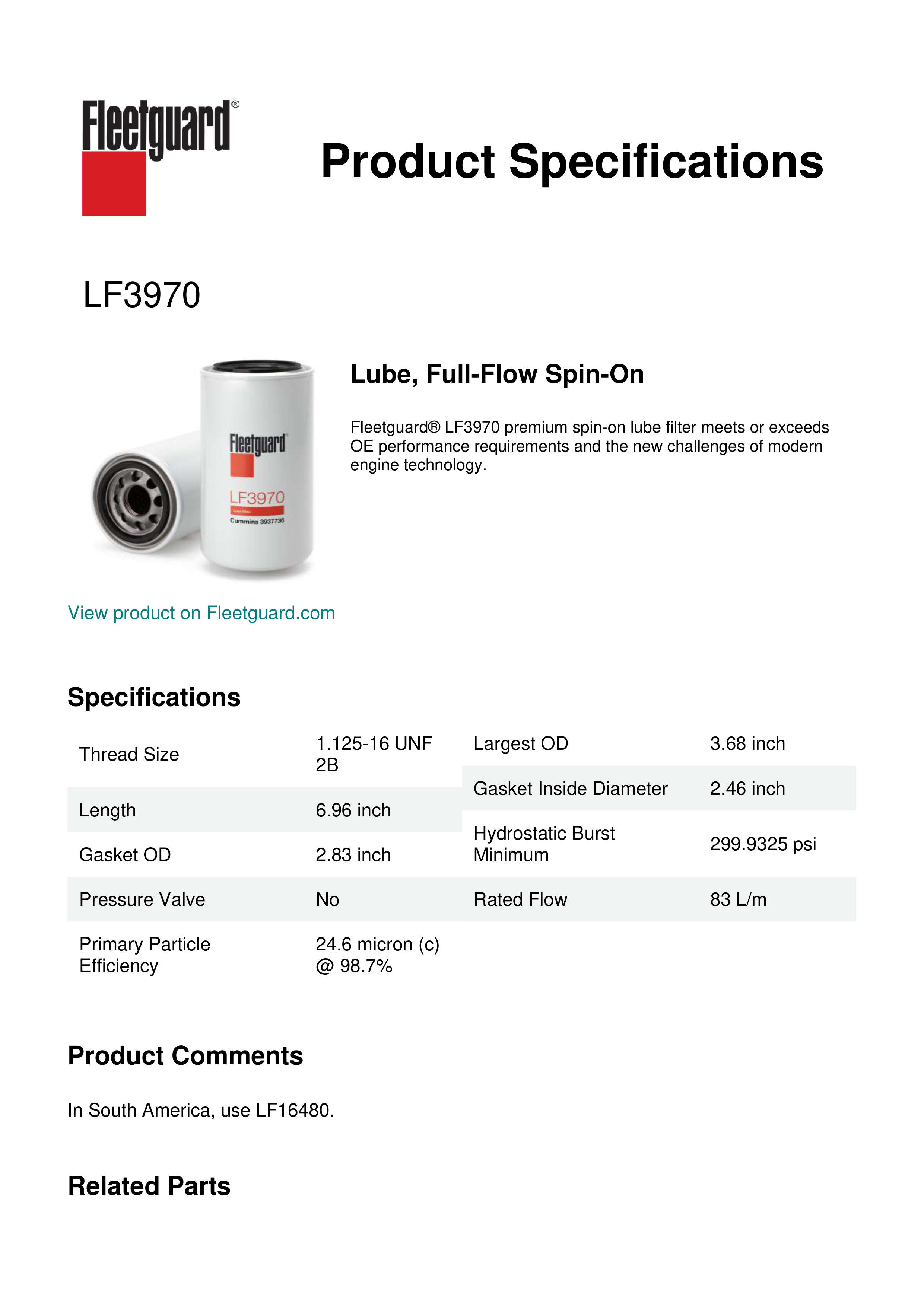Fleetguard® LF3970 premium spin-on lube filter meets or exceeds OE performance requirements and the new challenges of modern engine technology.Specification