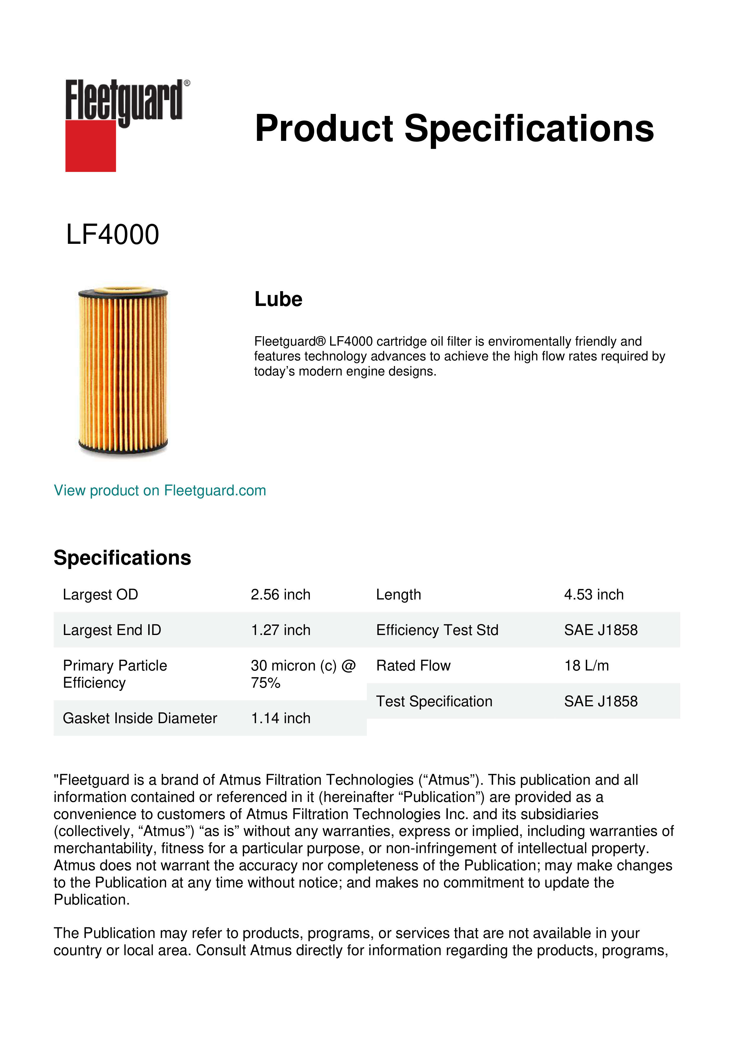 Fleetguard® LF4000 cartridge oil filter is enviromentally friendly and features technology advances to achieve the high flow rates required by today’s modern engine designs.Specification
