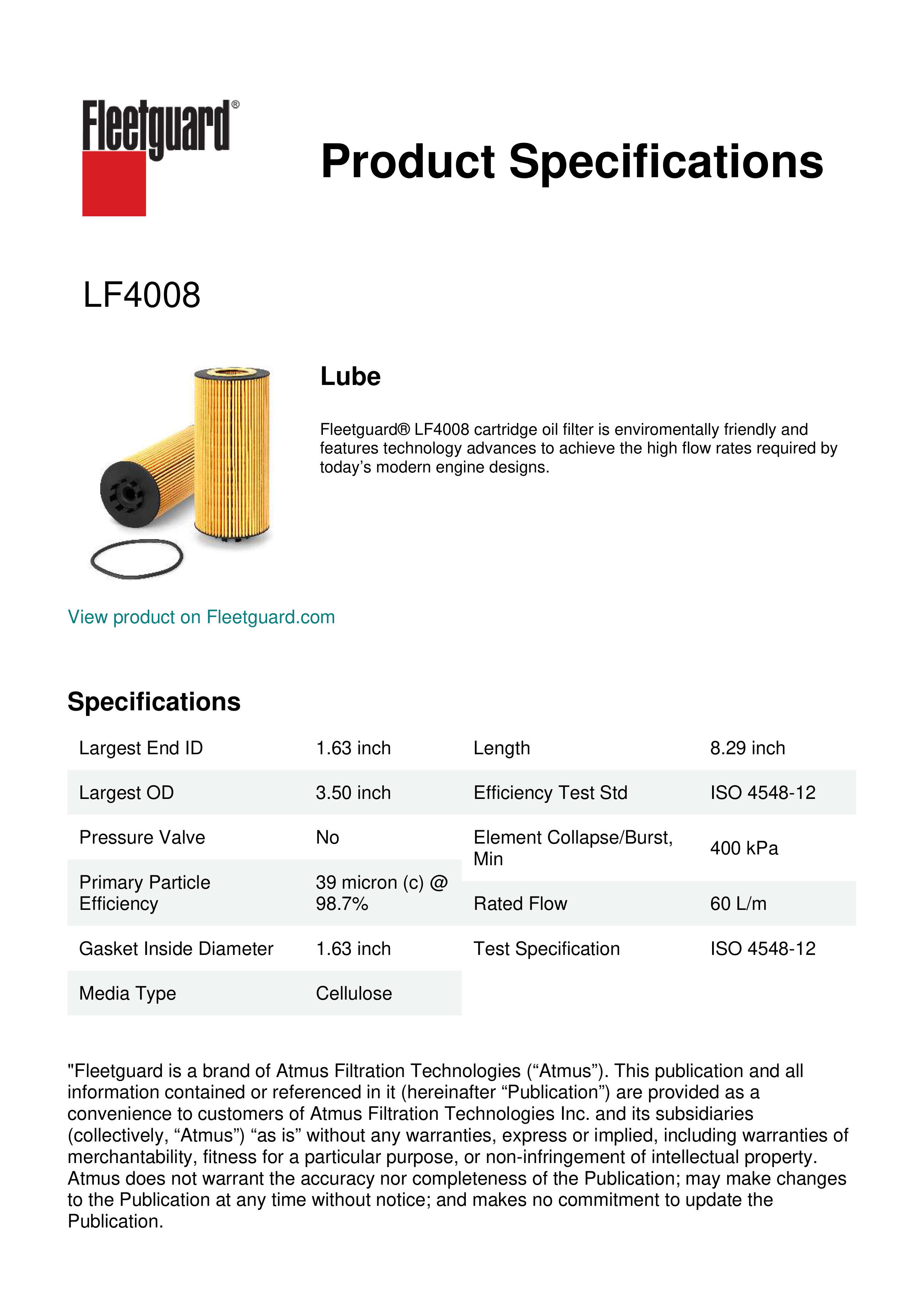 Fleetguard® LF4008 cartridge oil filter is enviromentally friendly and features technology advances to achieve the high flow rates required by today’s modern engine designs.Specification