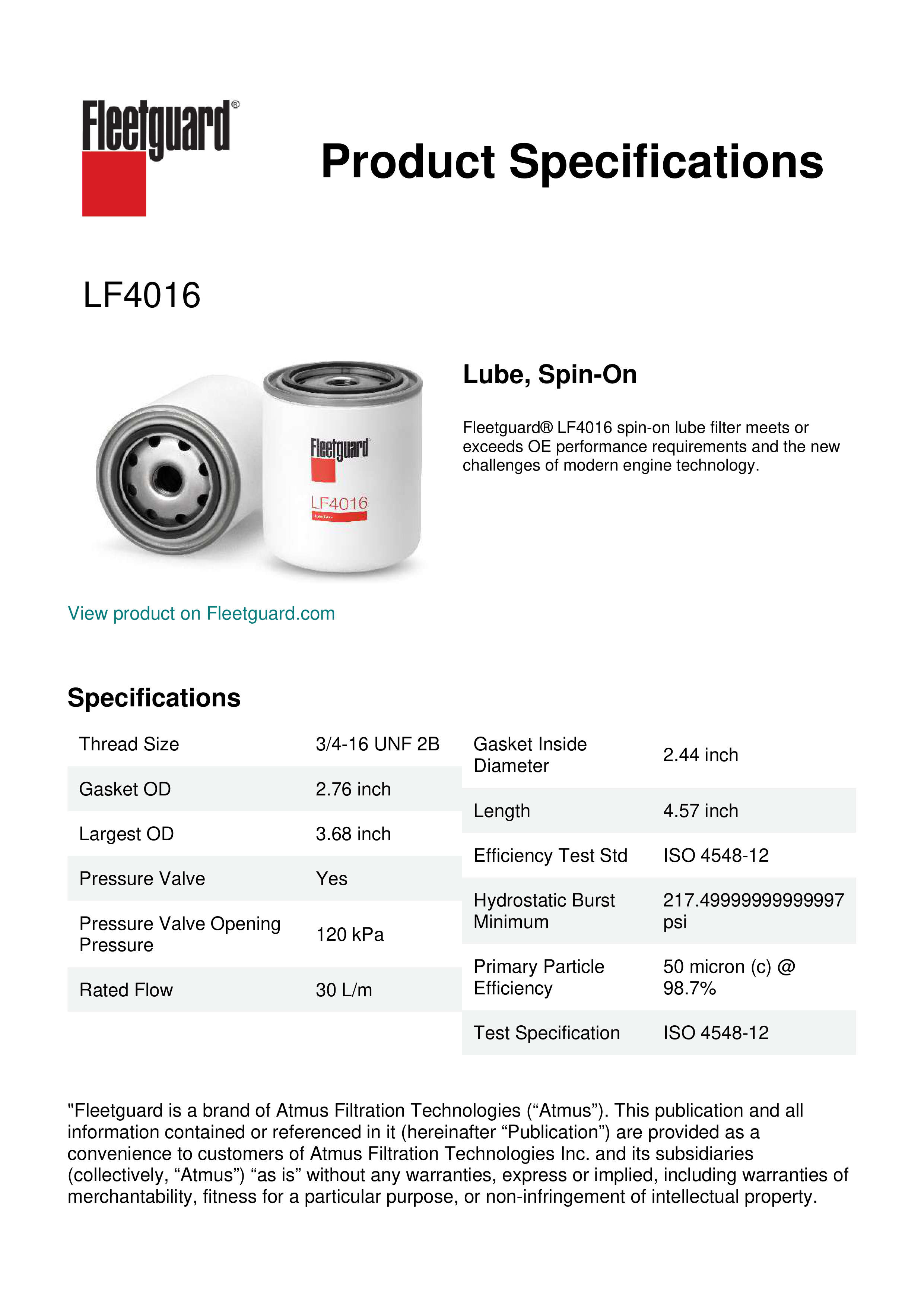 Fleetguard® LF4016 spin-on lube filter meets or exceeds OE performance requirements and the new challenges of modern engine technology.Specification