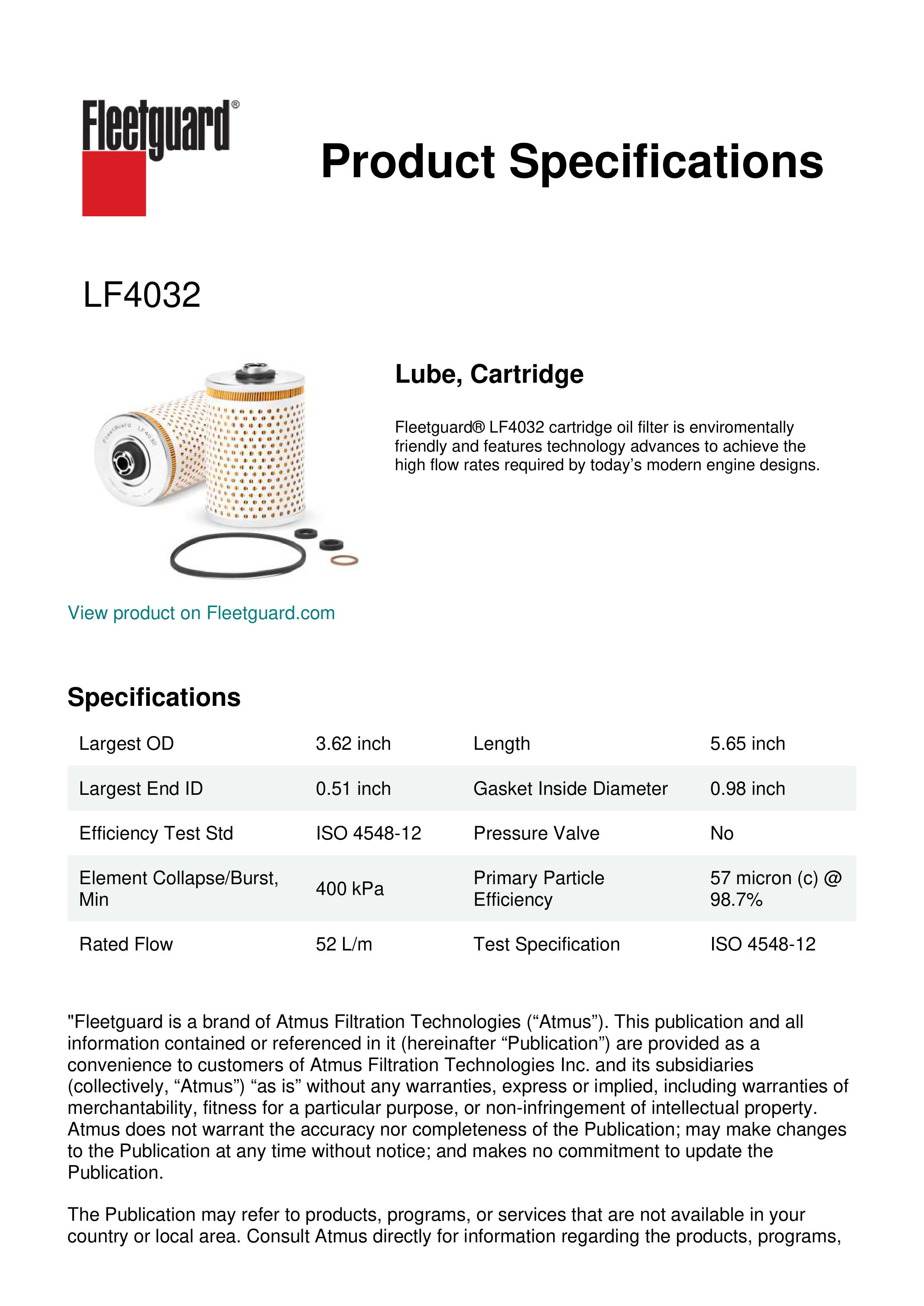 Fleetguard® LF4032 cartridge oil filter is enviromentally friendly and features technology advances to achieve the high flow rates required by today’s modern engine designs.Specification