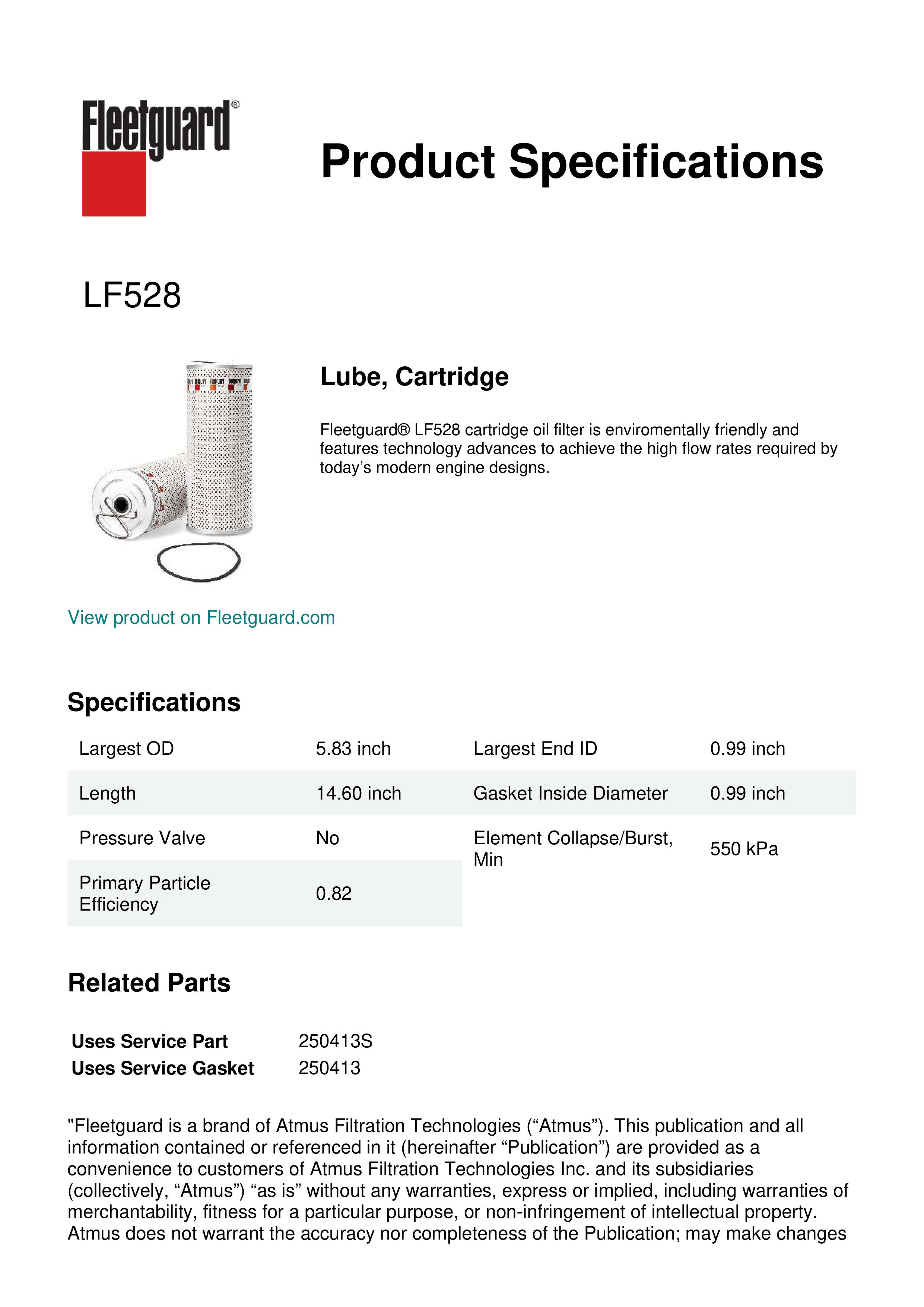Fleetguard® LF528 cartridge oil filter is enviromentally friendly and features technology advances to achieve the high flow rates required by today’s modern engine designs.Specification