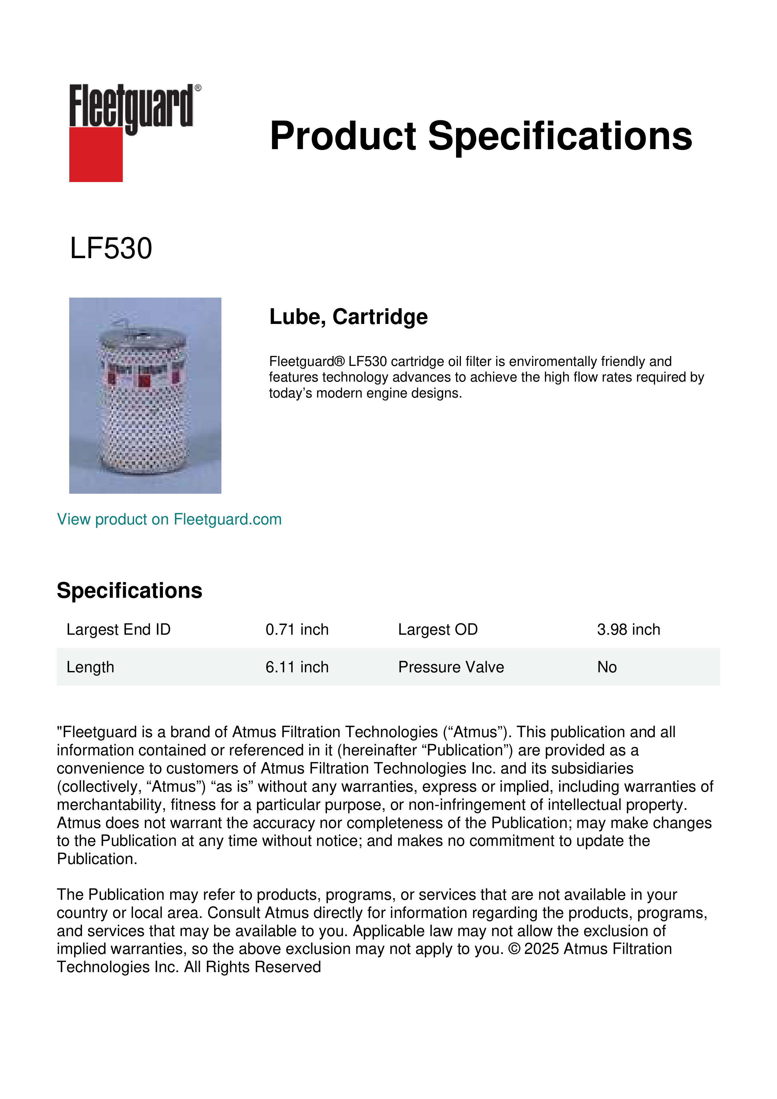 Fleetguard® LF530 cartridge oil filter is enviromentally friendly and features technology advances to achieve the high flow rates required by today’s modern engine designs.Specification