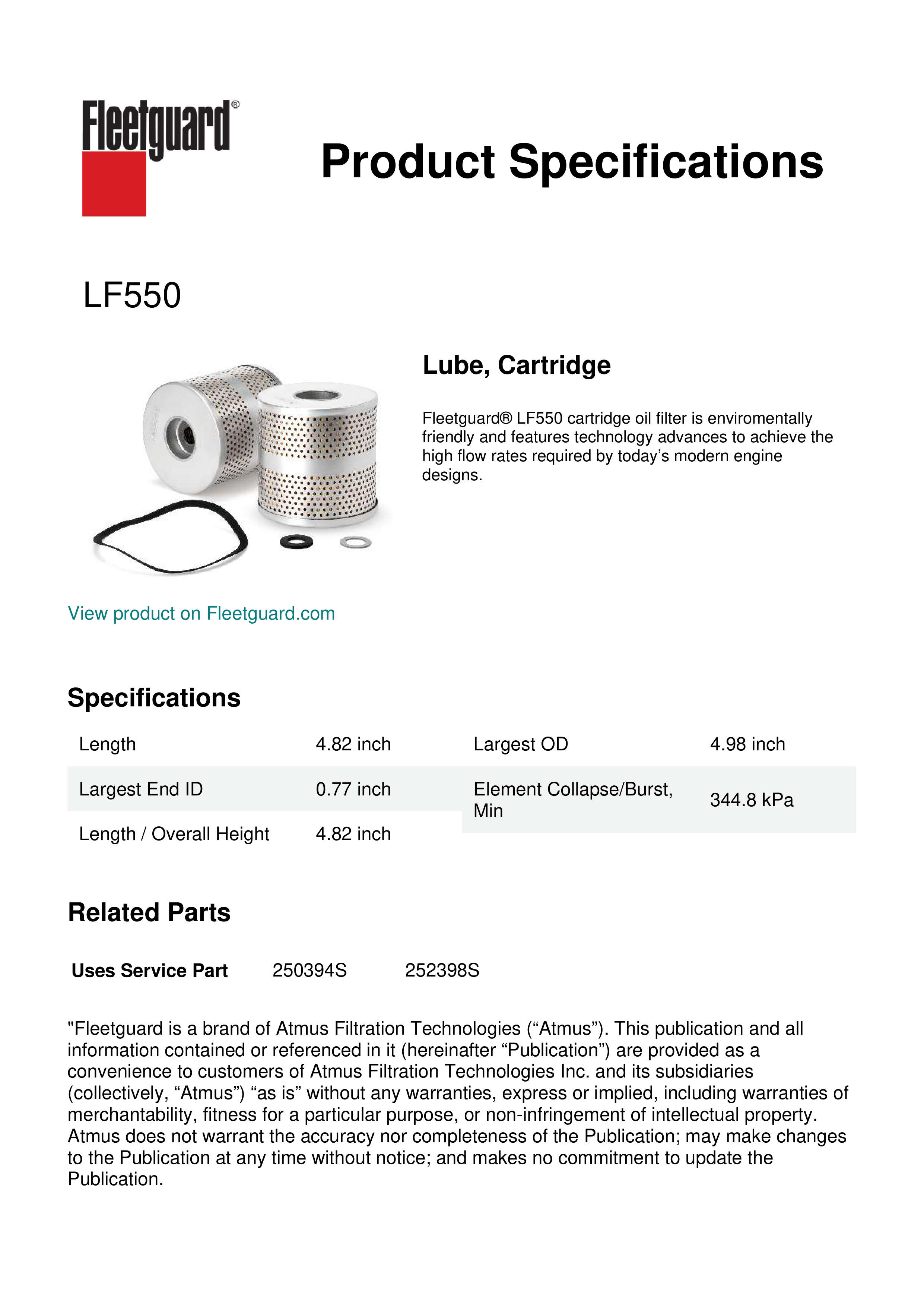 Fleetguard® LF550 cartridge oil filter is enviromentally friendly and features technology advances to achieve the high flow rates required by today’s modern engine designs.Specification
