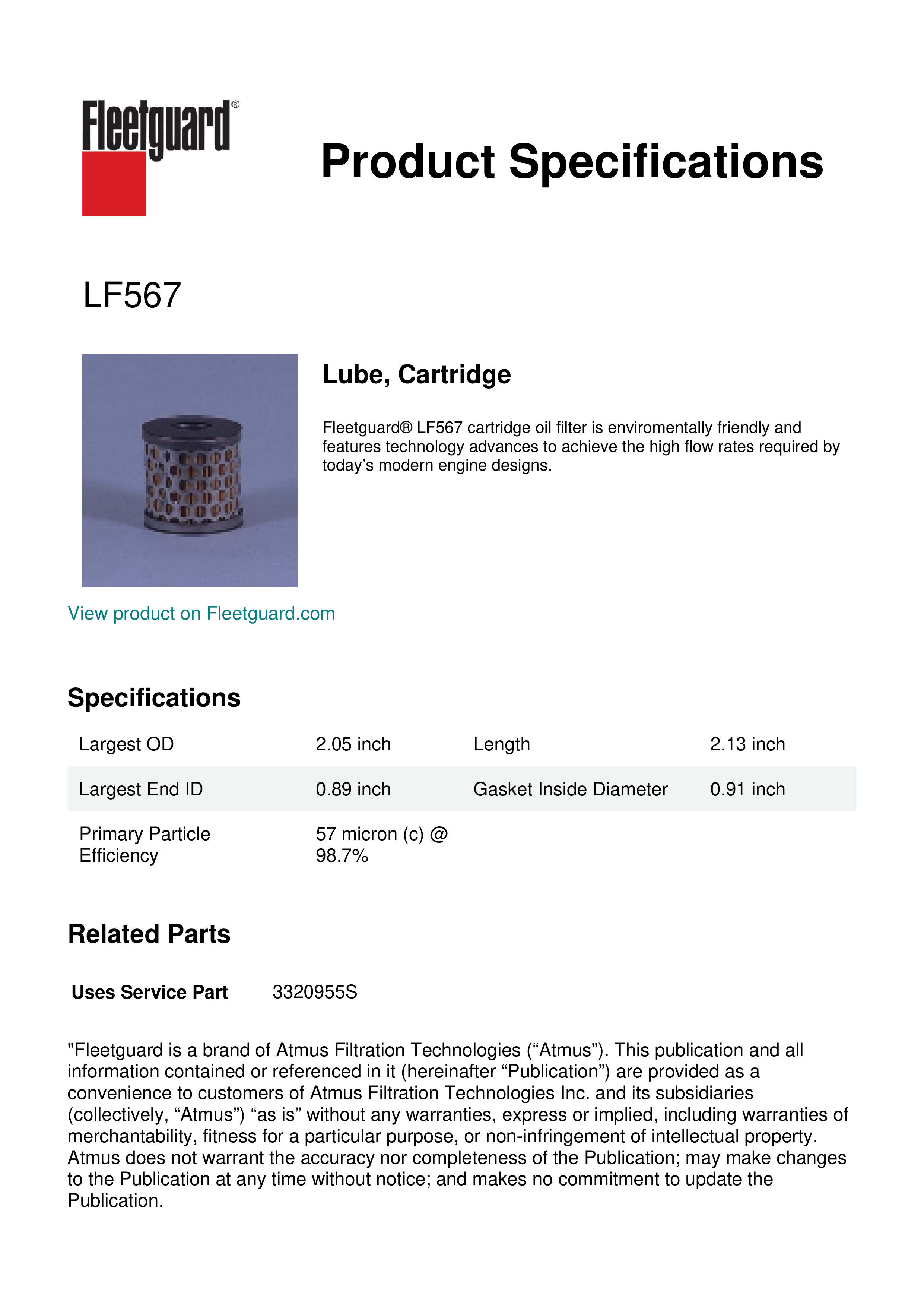 Fleetguard® LF567 cartridge oil filter is enviromentally friendly and features technology advances to achieve the high flow rates required by today’s modern engine designs.Specification