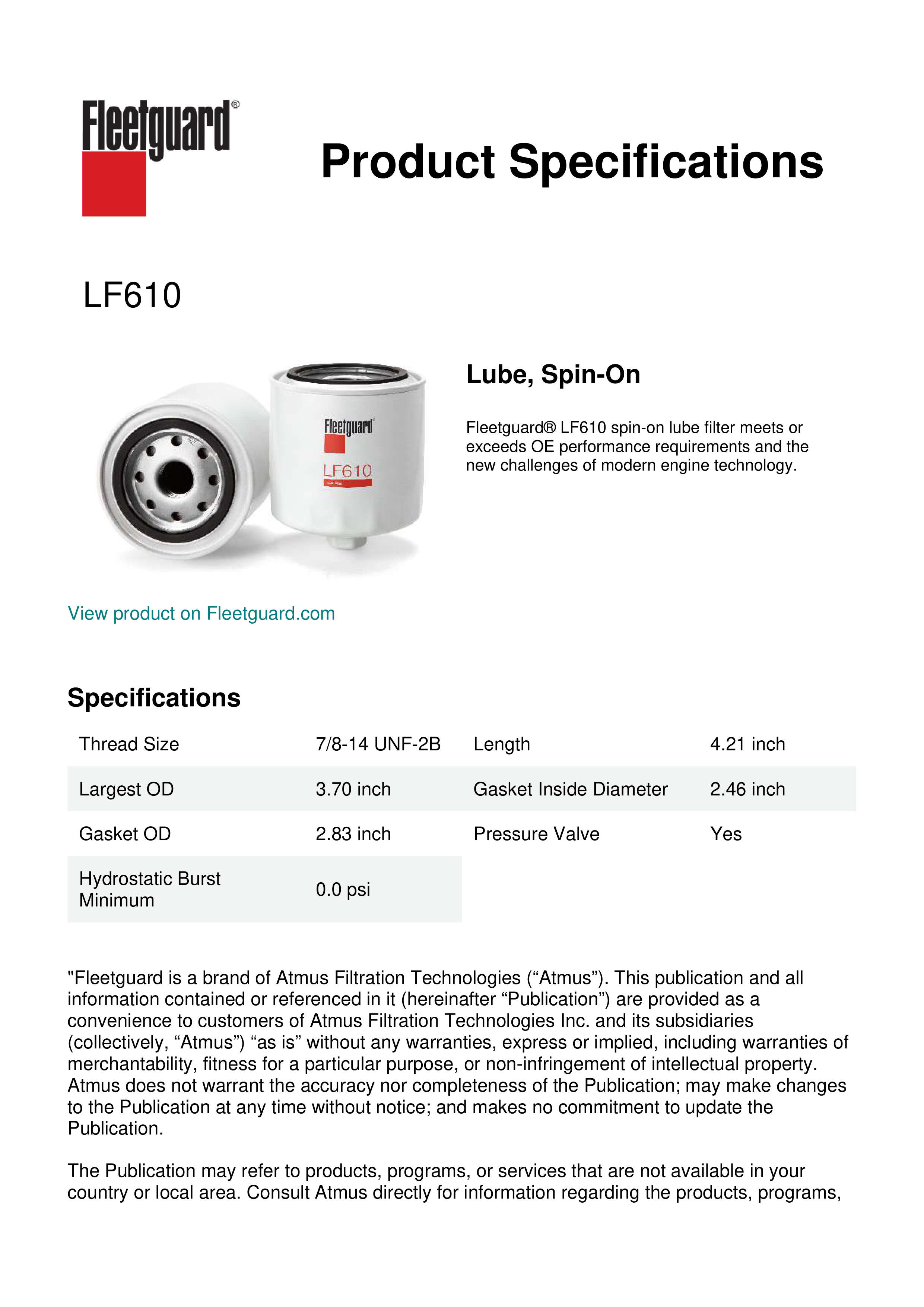 Fleetguard® LF610 spin-on lube filter meets or exceeds OE performance requirements and the new challenges of modern engine technology.Specification
