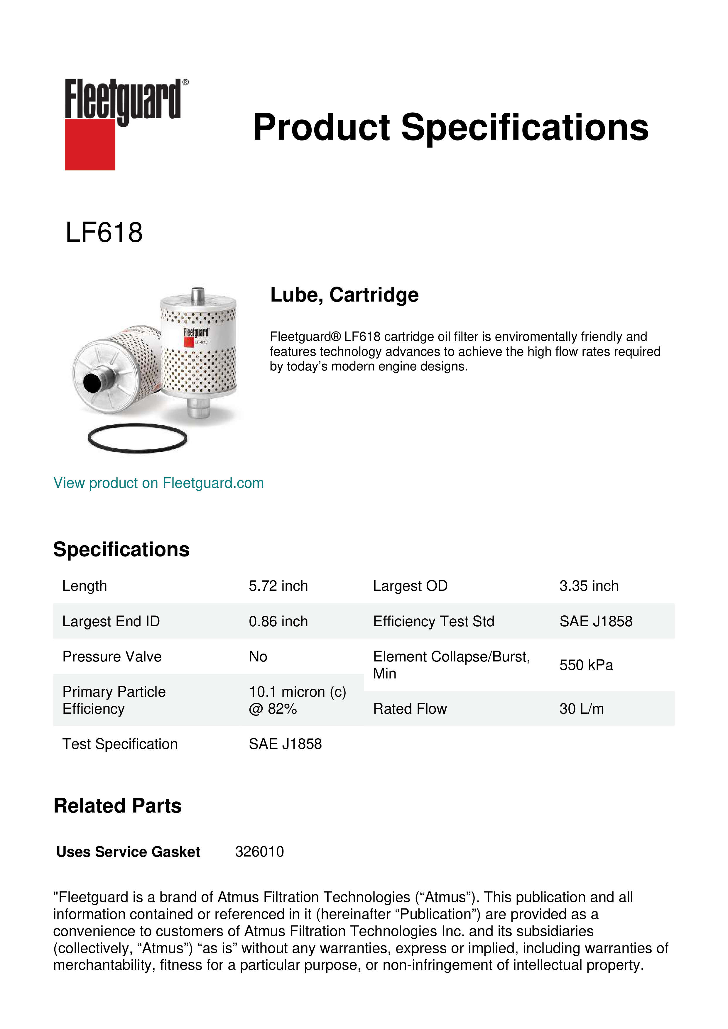 Fleetguard® LF618 cartridge oil filter is enviromentally friendly and features technology advances to achieve the high flow rates required by today’s modern engine designs.Specification