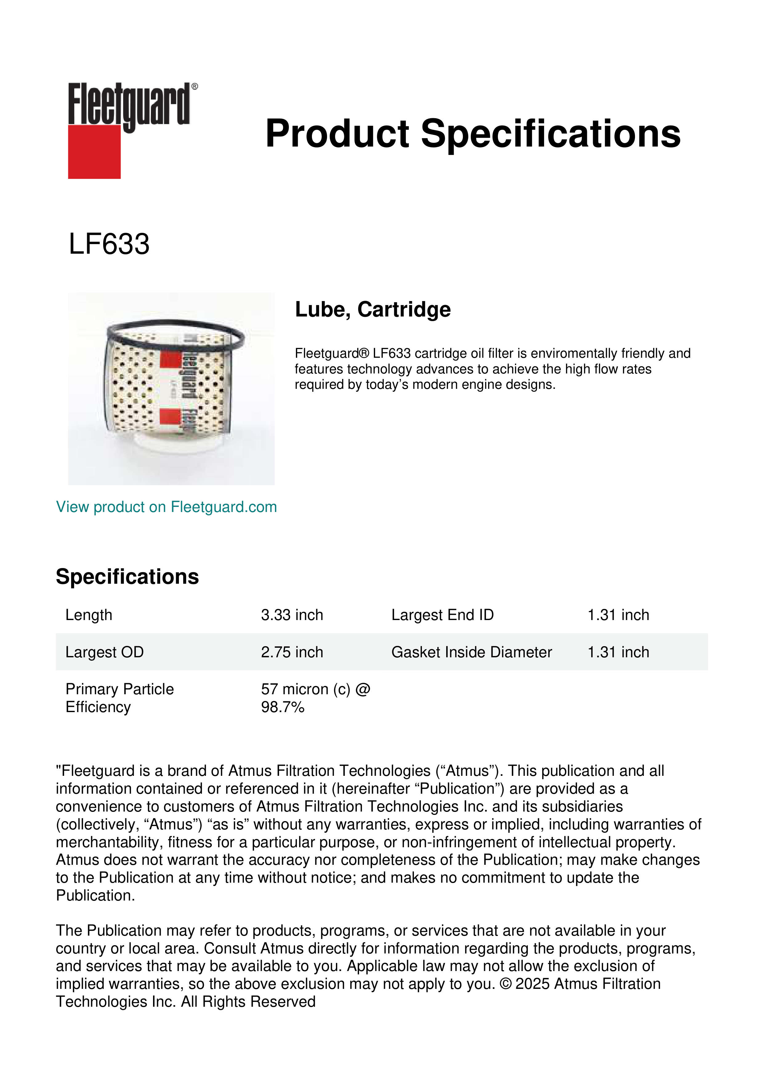 Fleetguard® LF633 cartridge oil filter is enviromentally friendly and features technology advances to achieve the high flow rates required by today’s modern engine designs.Specification