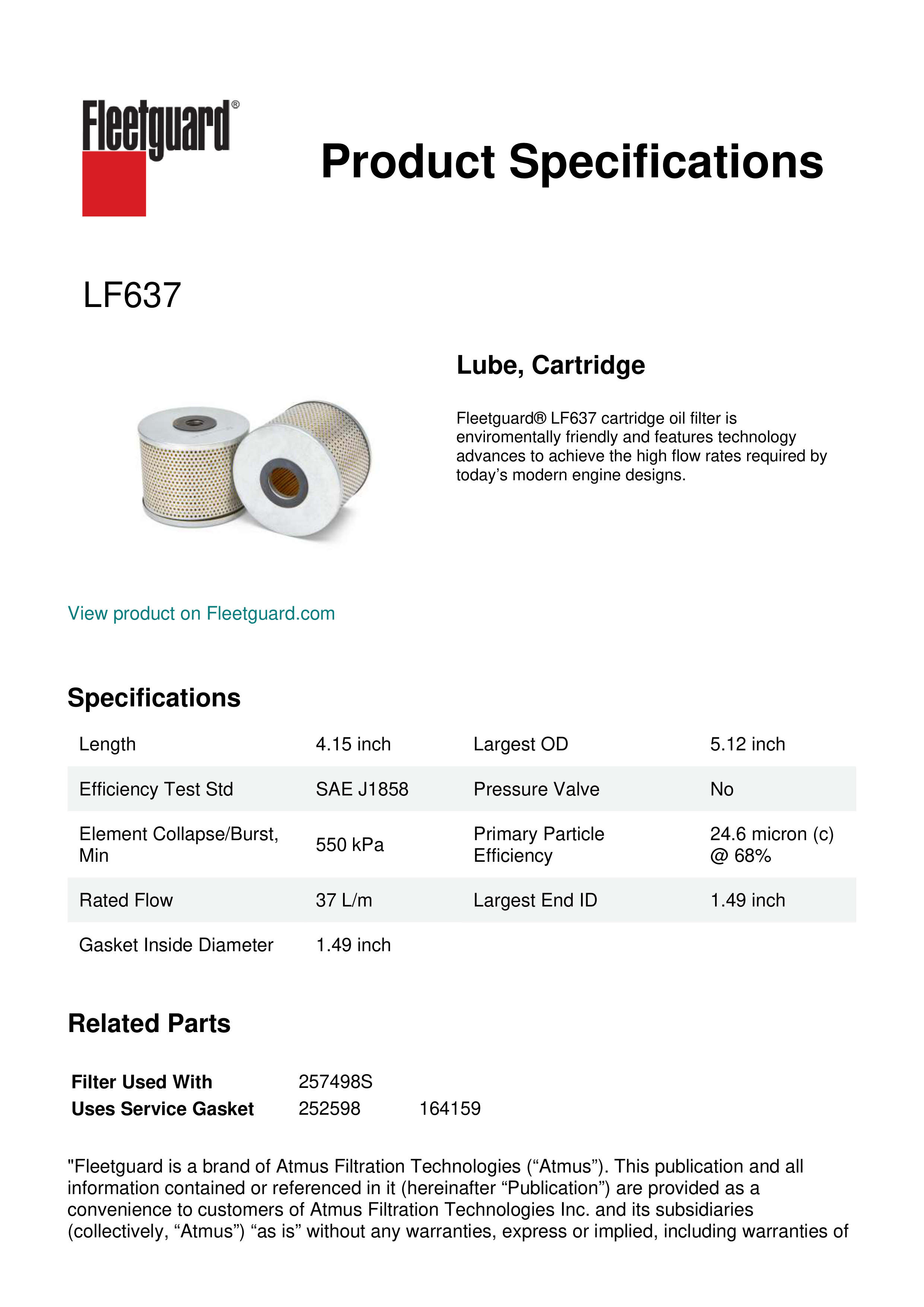 Fleetguard® LF637 cartridge oil filter is enviromentally friendly and features technology advances to achieve the high flow rates required by today’s modern engine designs.Specification