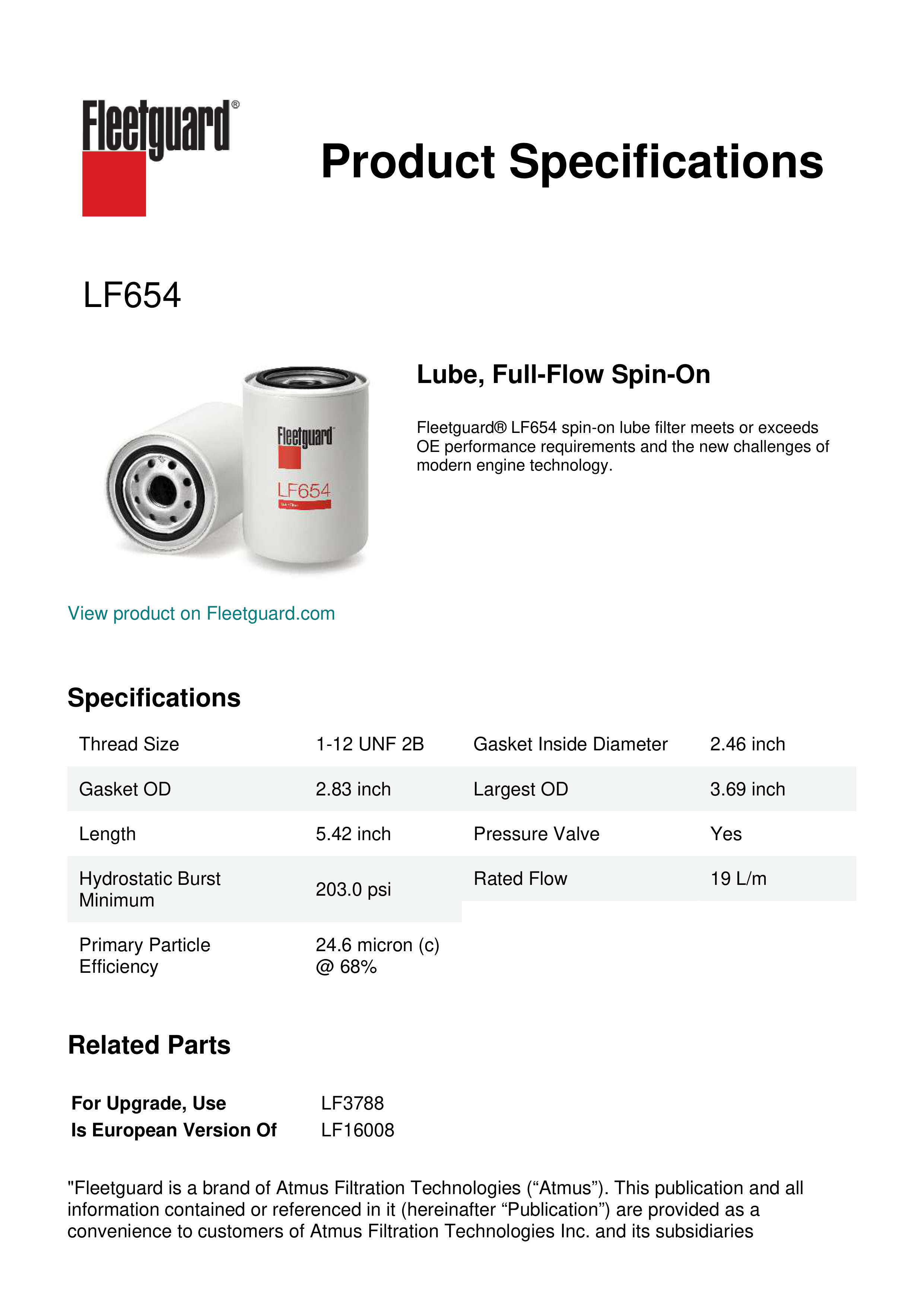 Fleetguard® LF654 spin-on lube filter meets or exceeds OE performance requirements and the new challenges of modern engine technology.Specification