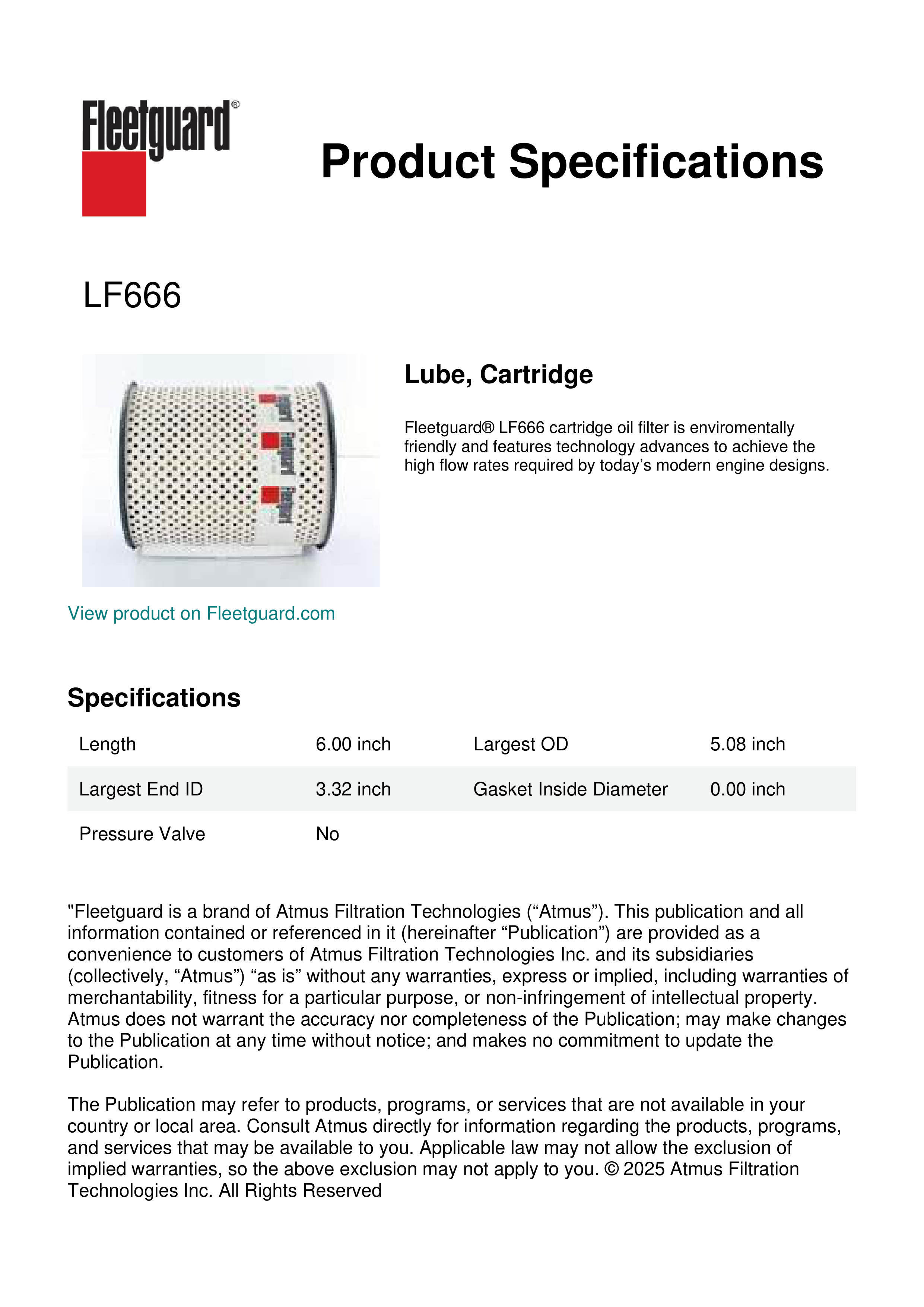 Fleetguard® LF666 cartridge oil filter is enviromentally friendly and features technology advances to achieve the high flow rates required by today’s modern engine designs.Specification