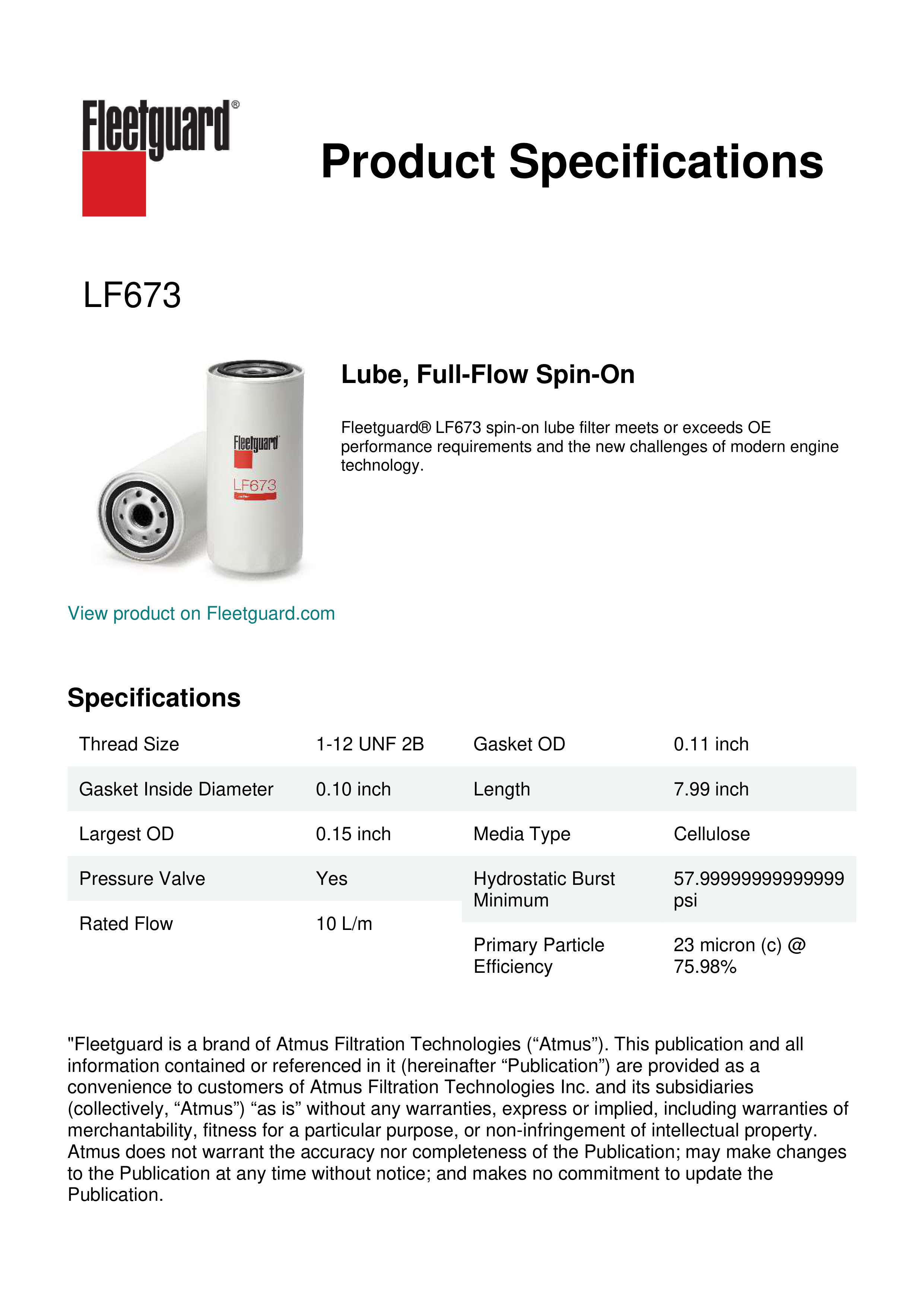 Fleetguard® LF673 spin-on lube filter meets or exceeds OE performance requirements and the new challenges of modern engine technology.Specification