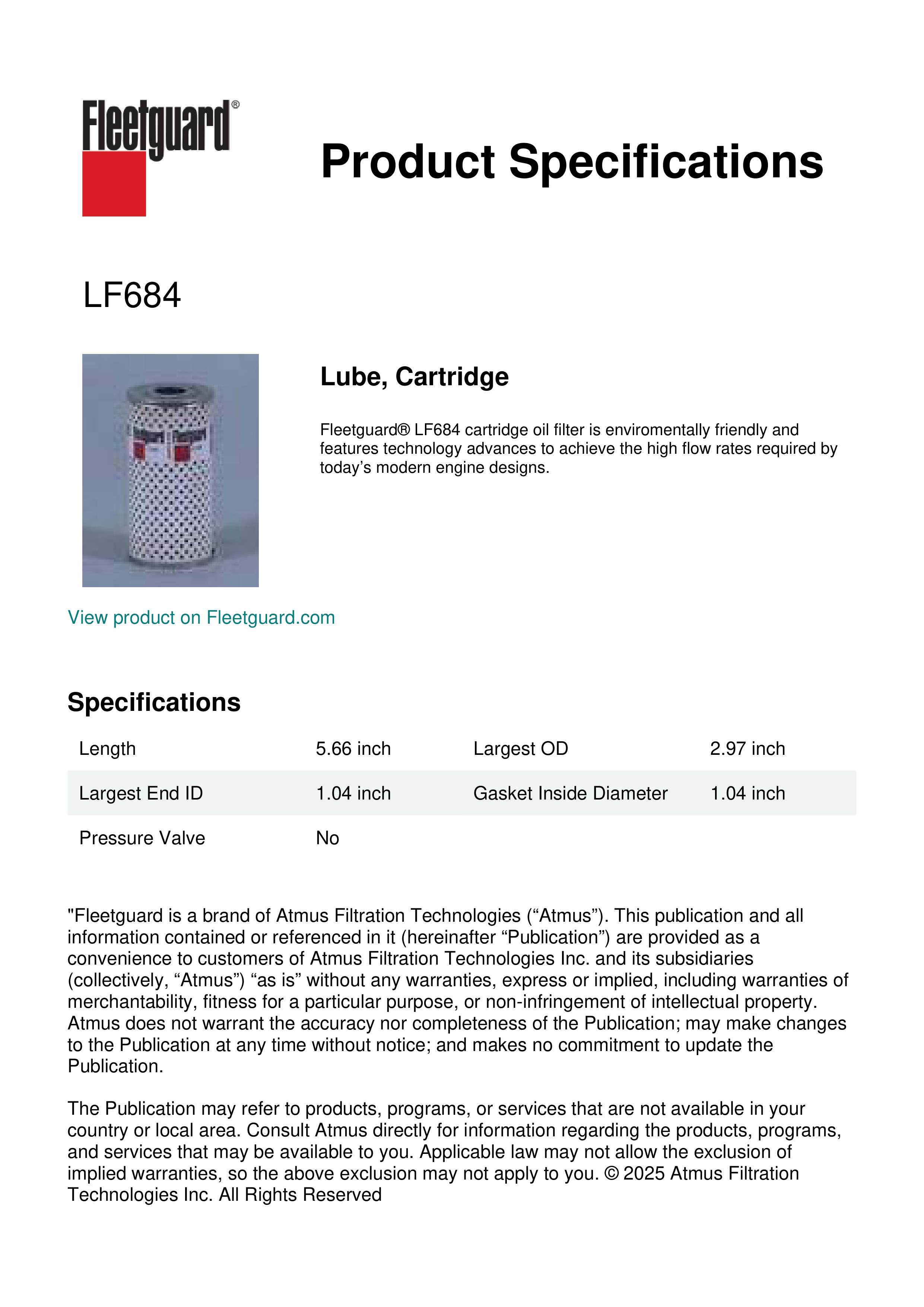 Fleetguard® LF684 cartridge oil filter is enviromentally friendly and features technology advances to achieve the high flow rates required by today’s modern engine designs.Specification