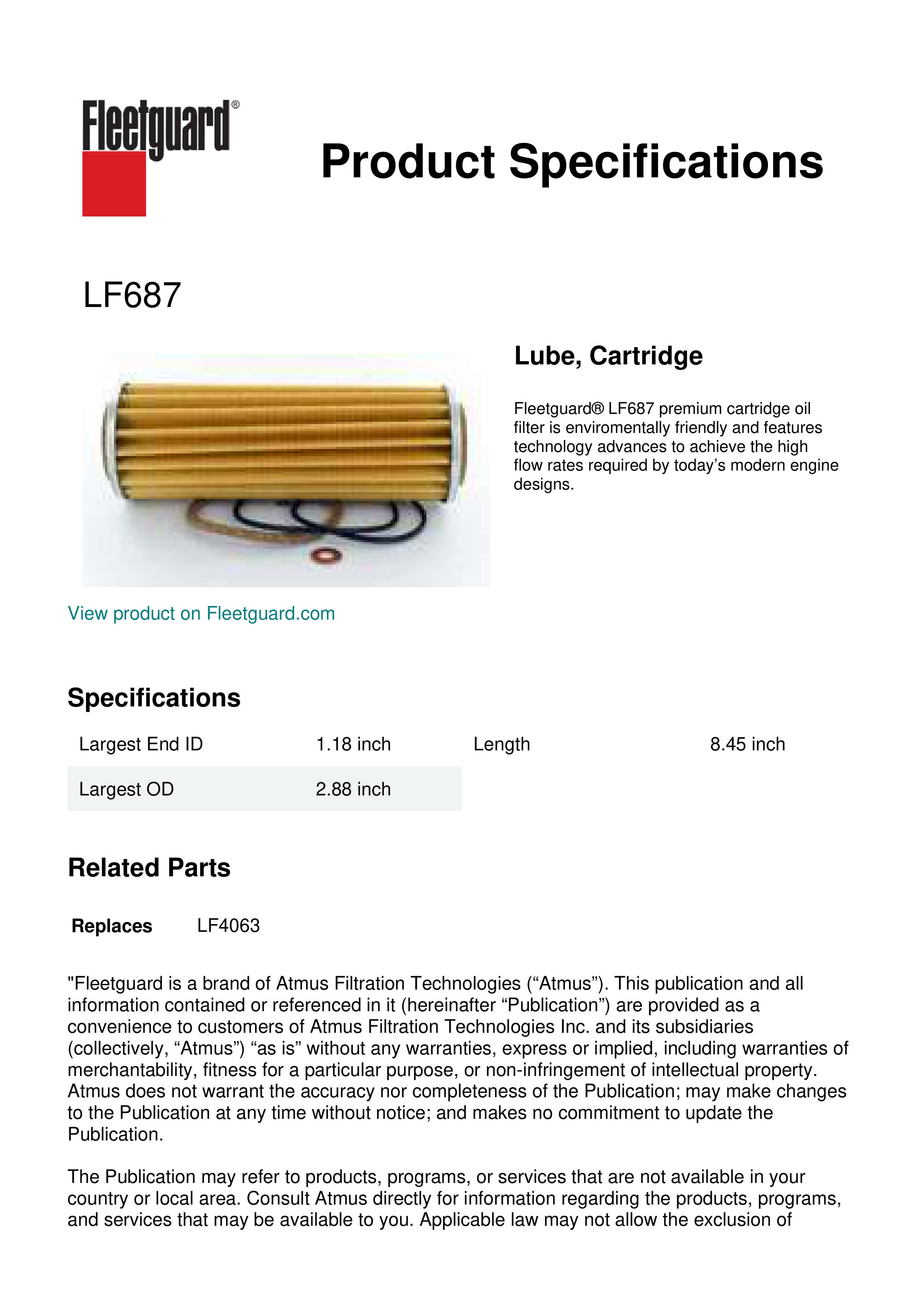 Fleetguard® LF687 premium cartridge oil filter is enviromentally friendly and features technology advances to achieve the high flow rates required by today’s modern engine designs.Specification