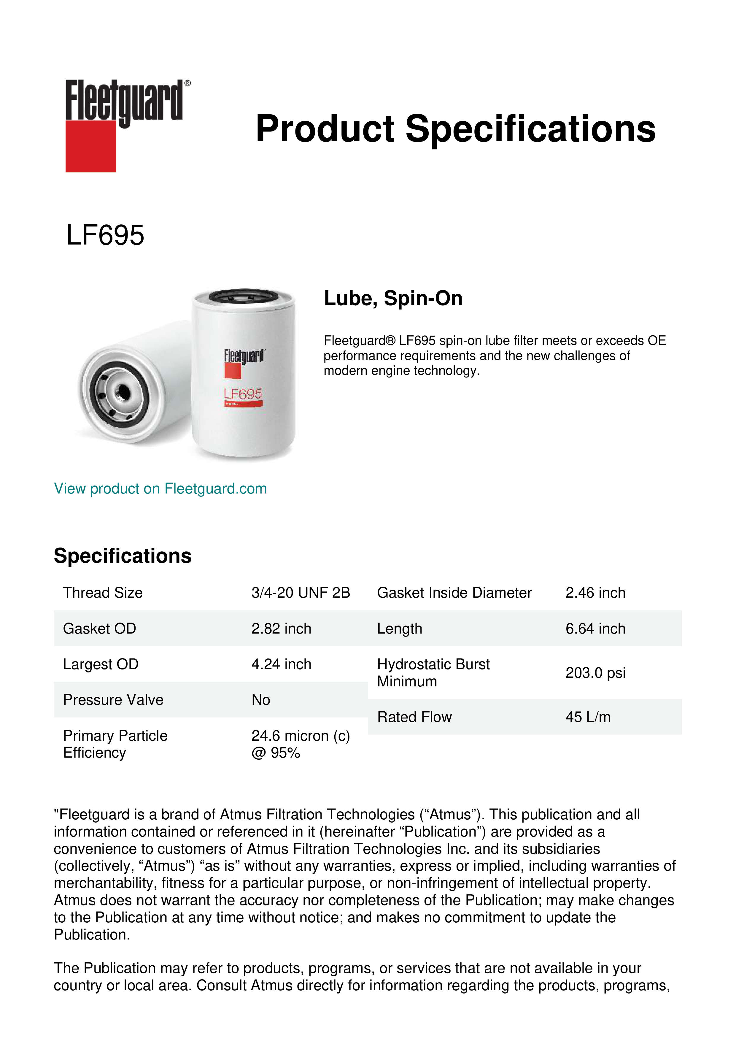 Fleetguard® LF695 spin-on lube filter meets or exceeds OE performance requirements and the new challenges of modern engine technology.Specification