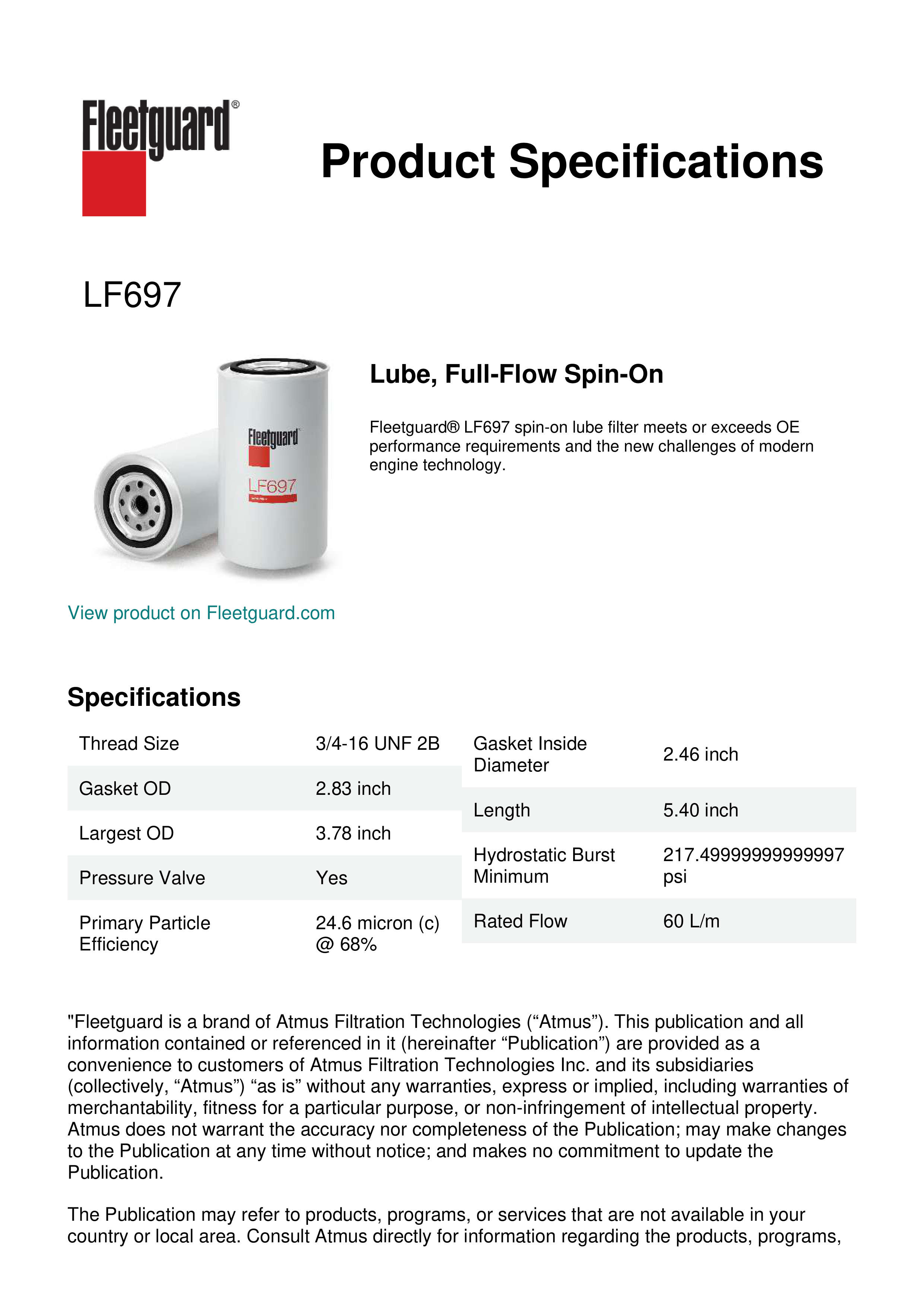 Fleetguard® LF697 spin-on lube filter meets or exceeds OE performance requirements and the new challenges of modern engine technology.Specification