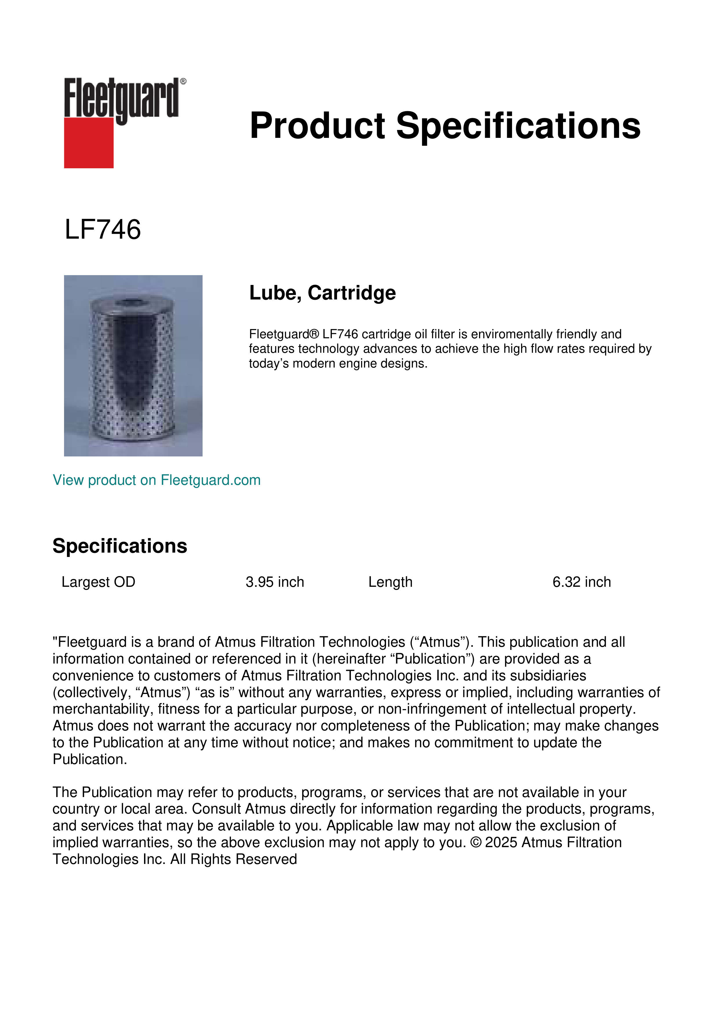 Fleetguard® LF746 cartridge oil filter is enviromentally friendly and features technology advances to achieve the high flow rates required by today’s modern engine designs.Specification