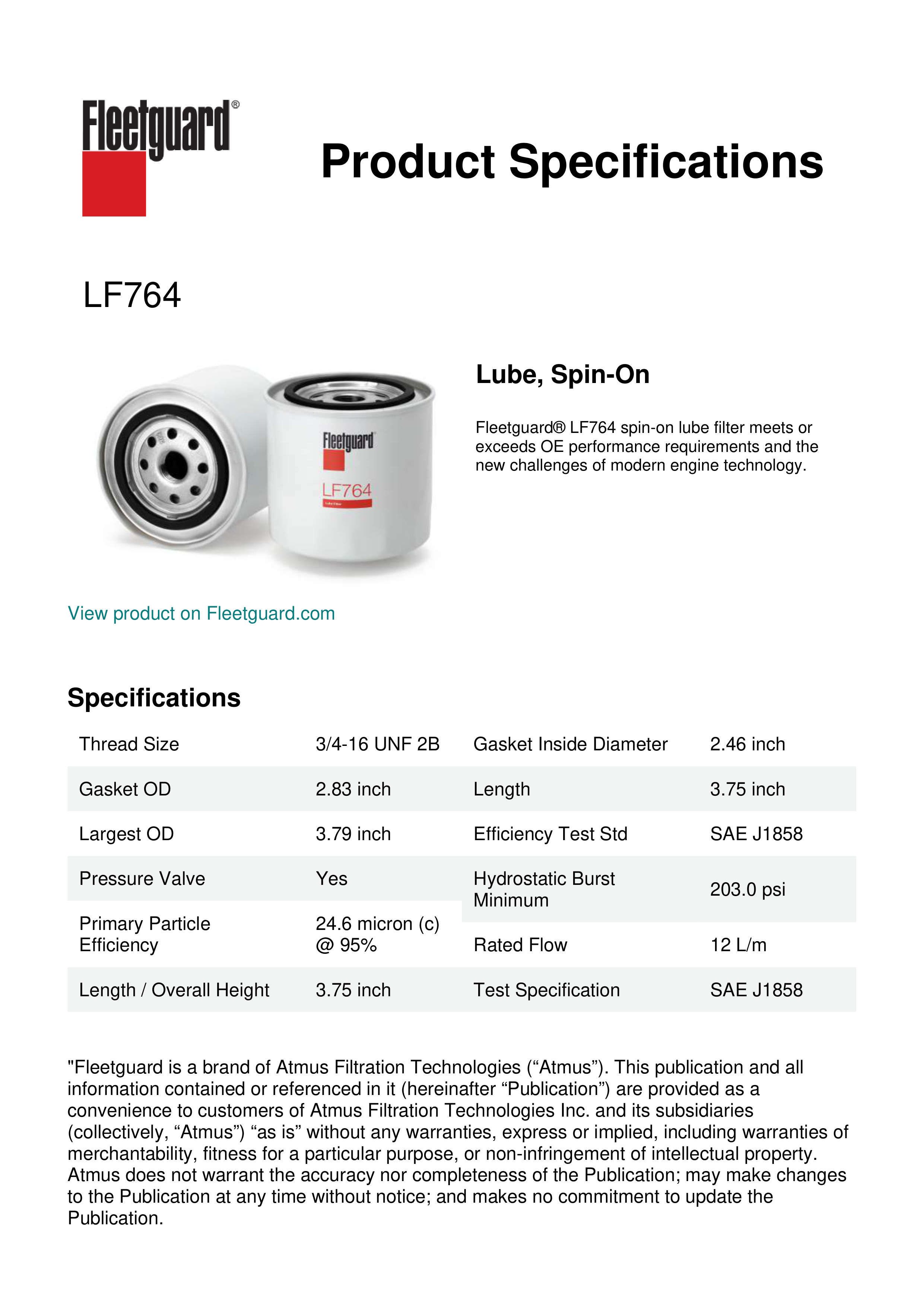 Fleetguard® LF764 spin-on lube filter meets or exceeds OE performance requirements and the new challenges of modern engine technology.Specification
