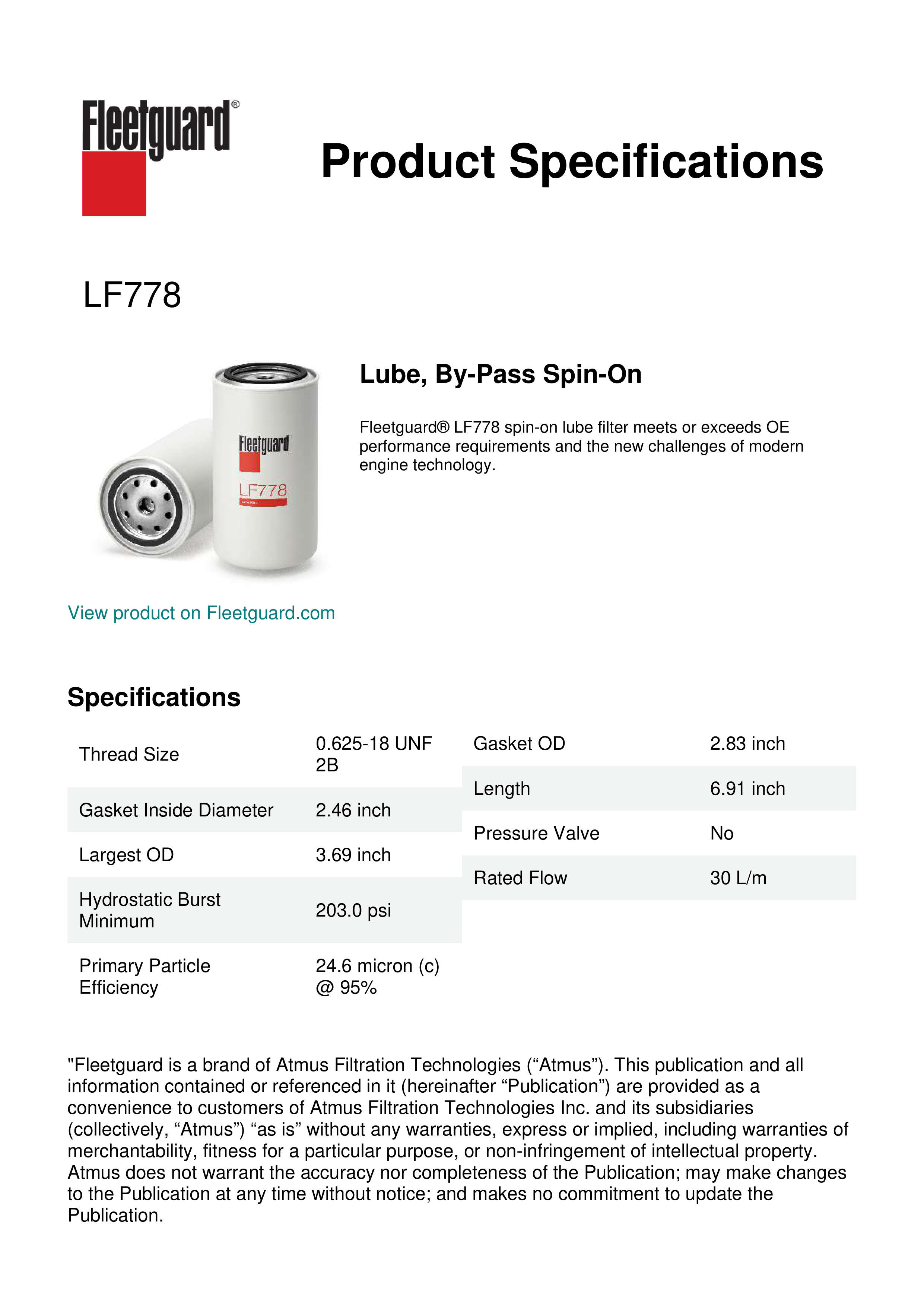 Fleetguard® LF778 spin-on lube filter meets or exceeds OE performance requirements and the new challenges of modern engine technology.Specification
