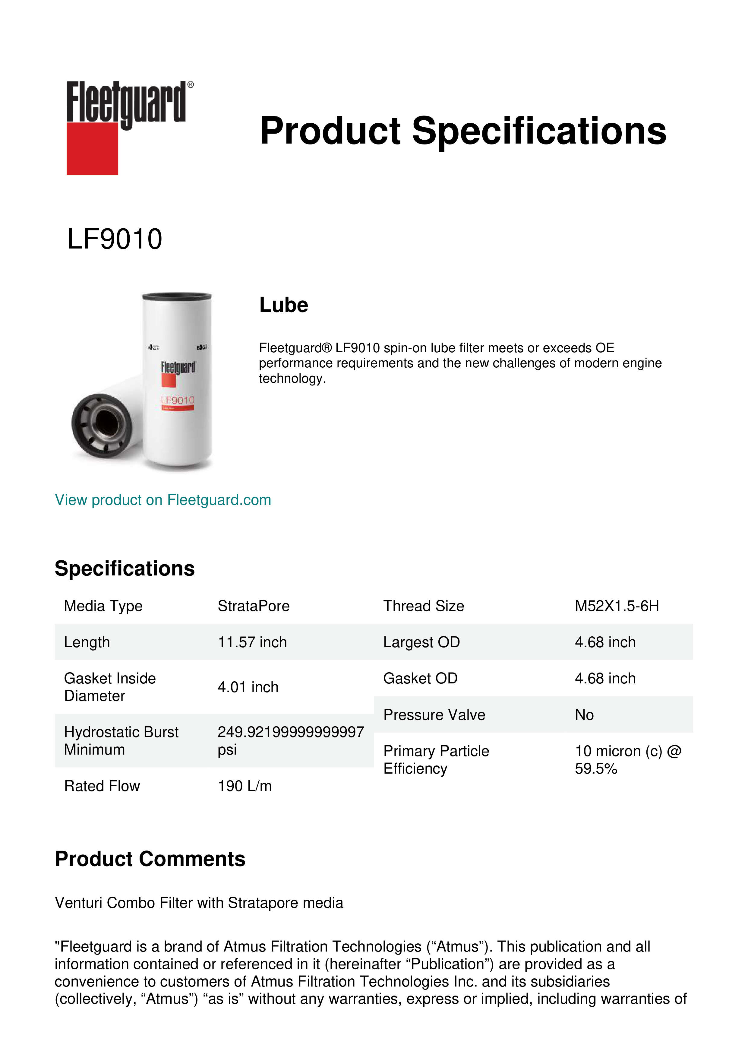 Fleetguard® LF9010 spin-on lube filter meets or exceeds OE performance requirements and the new challenges of modern engine technology.Specification