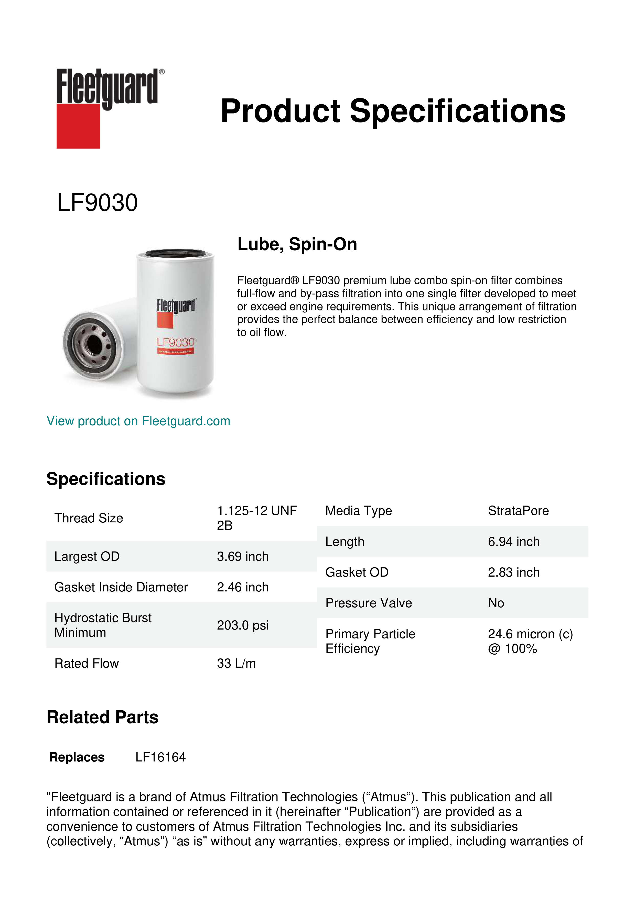 Fleetguard® LF9030 premium lube combo spin-on filter combines full-flow and by-pass filtration into one single filter developed to meet or exceed engine requirements. This unique arrangement of filtration provides the perfect balance between efficiency and low restriction to oil flow.Specification