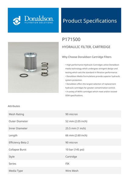 Genuine Donaldson P171500 Hydraulic Filter, Cartridge is designed to provide superior protection for your hydraulic system, effectively capturing contaminants to ensure clean fluid circulation. With high-quality filtration media, it extends equipment life, improves operational efficiency, and maintains fluid cleanliness even in the most demanding environments.