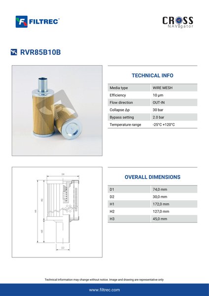 Engineered with their high performance media and a durable design, the RVR85B10B provides reliable and consistent performance over its lifespan, even in harsh operating environments. When you order from FilterFinder, you can trust that you are getting a reliable and high-quality replacement filter that will keep your system running smoothly.
