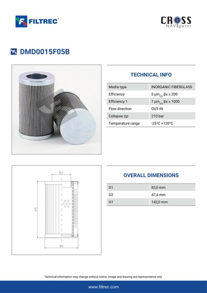Genuine Filtrec DMD0015F05B. This Filtrec element is designed to meet or exceed the quality and performance of brand OEM’s ensuring superior filtration performance and long-lasting durability.Engineered with their high performance media and a durable design, the DMD0015F05B provides reliable and consistent performance over its lifespan, even in harsh operating environments. When you order from FilterFinder, you can trust that you are getting a reliable and high-quality replacement filter that will keep your system running smoothly.