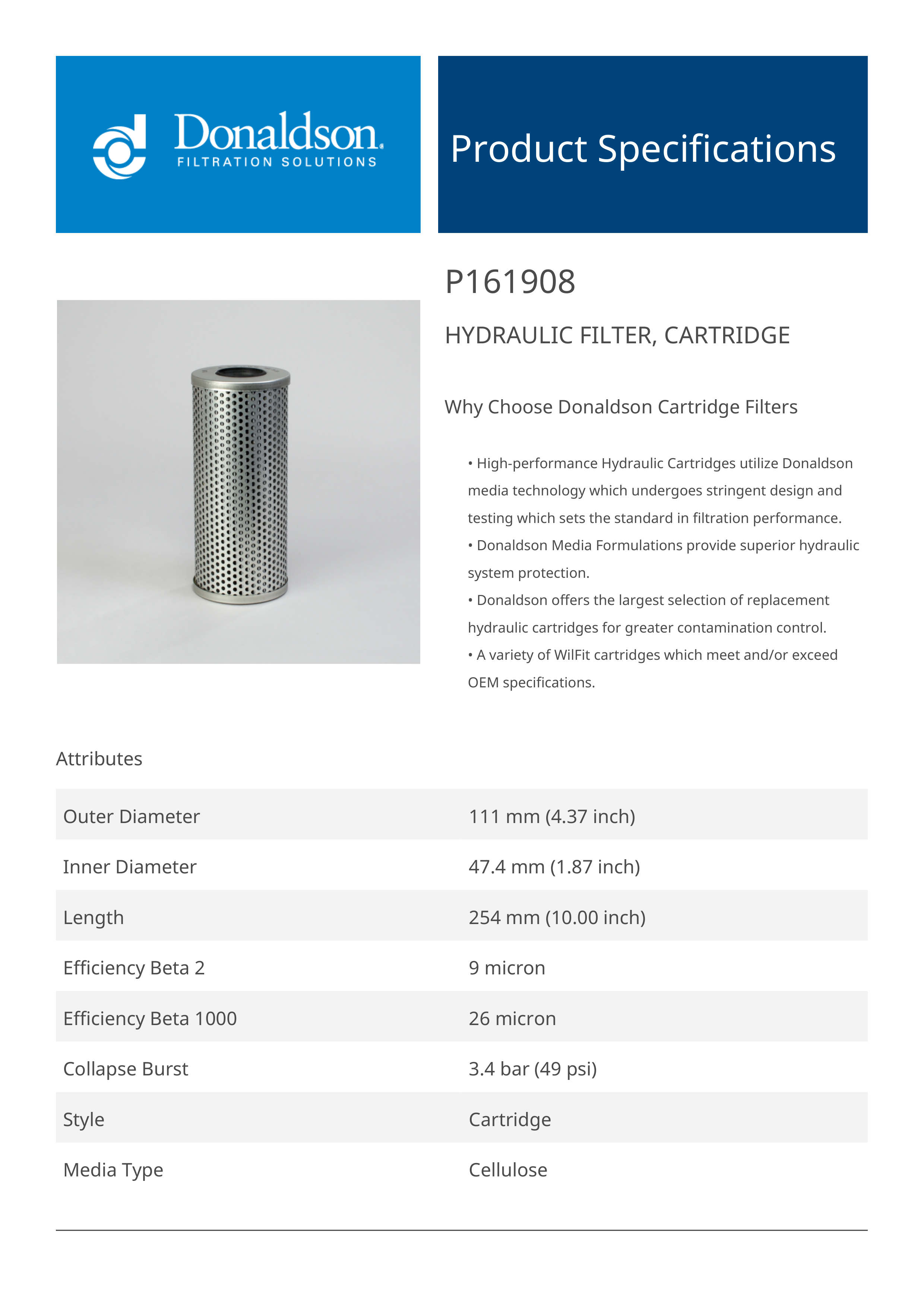 Genuine Donaldson P161908 Hydraulic Cartridge offers superior filtration performance, effectively removing contaminants from hydraulic fluids. Its high-capacity design helps maintain fluid cleanliness and system efficiency.