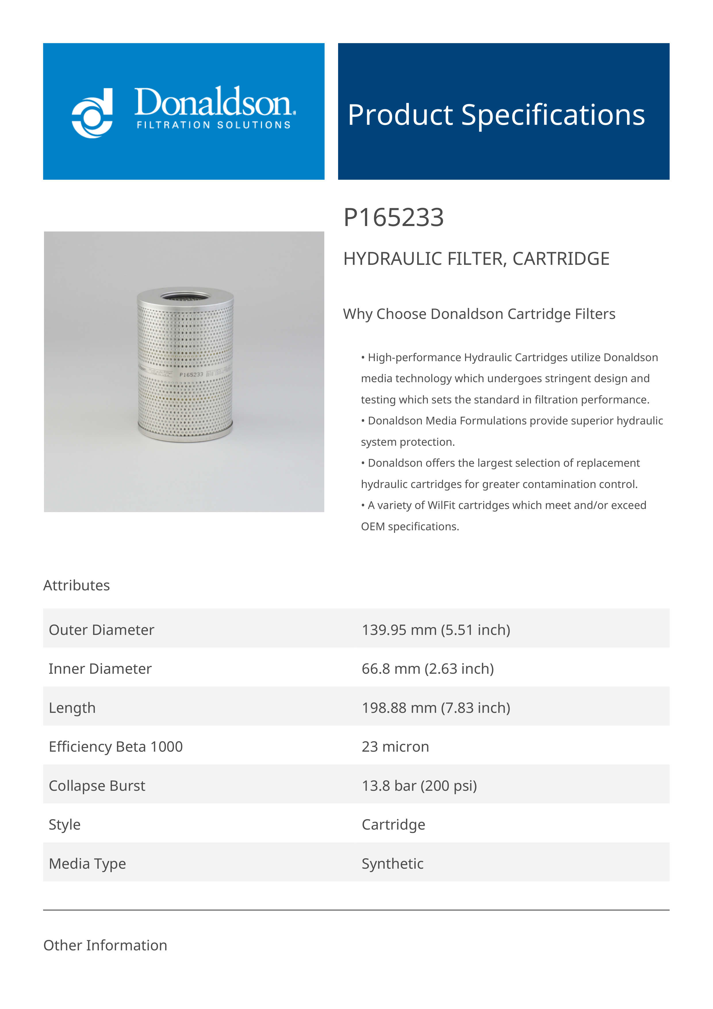Genuine Donaldson P165233 Hydraulic Cartridge offers superior filtration performance, effectively removing contaminants from hydraulic fluids. Its high-capacity design helps maintain fluid cleanliness and system efficiency.