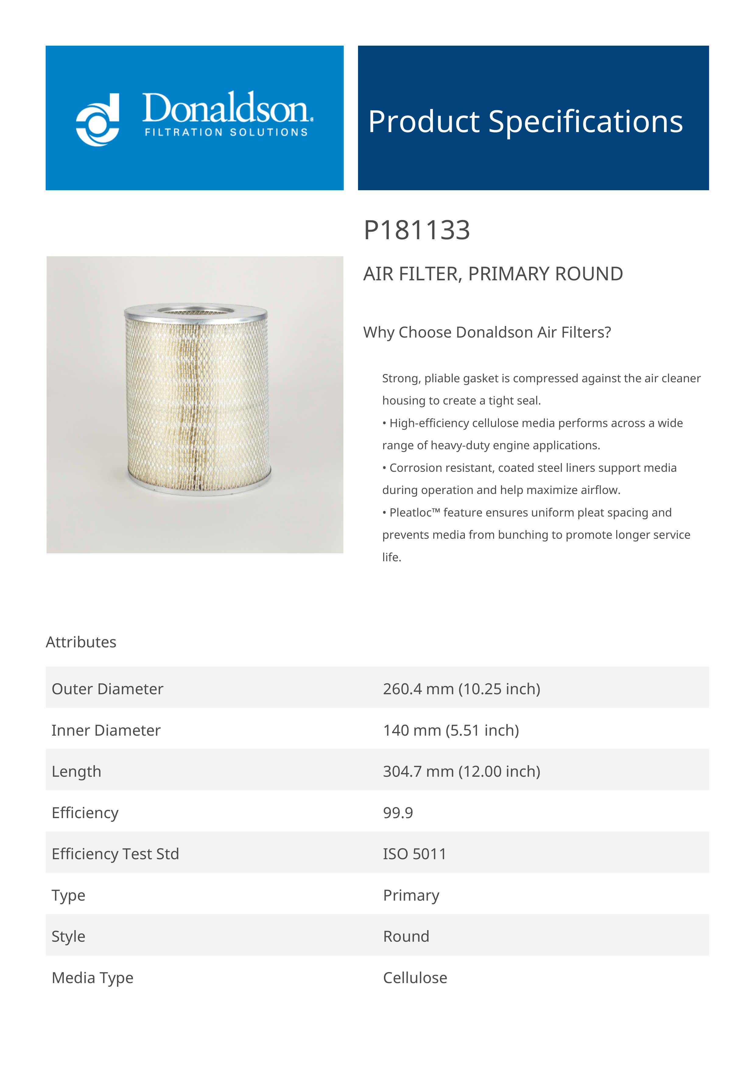 Genuine Donaldson P181133 Air Primary, Round provides clean, efficient airflow for engines by trapping airborne contaminants. Its round design maximizes filtration surface area while maintaining high airflow rates.Perfect for heavy-duty applications, this air primary filter enhances engine longevity and supports consistent performance.