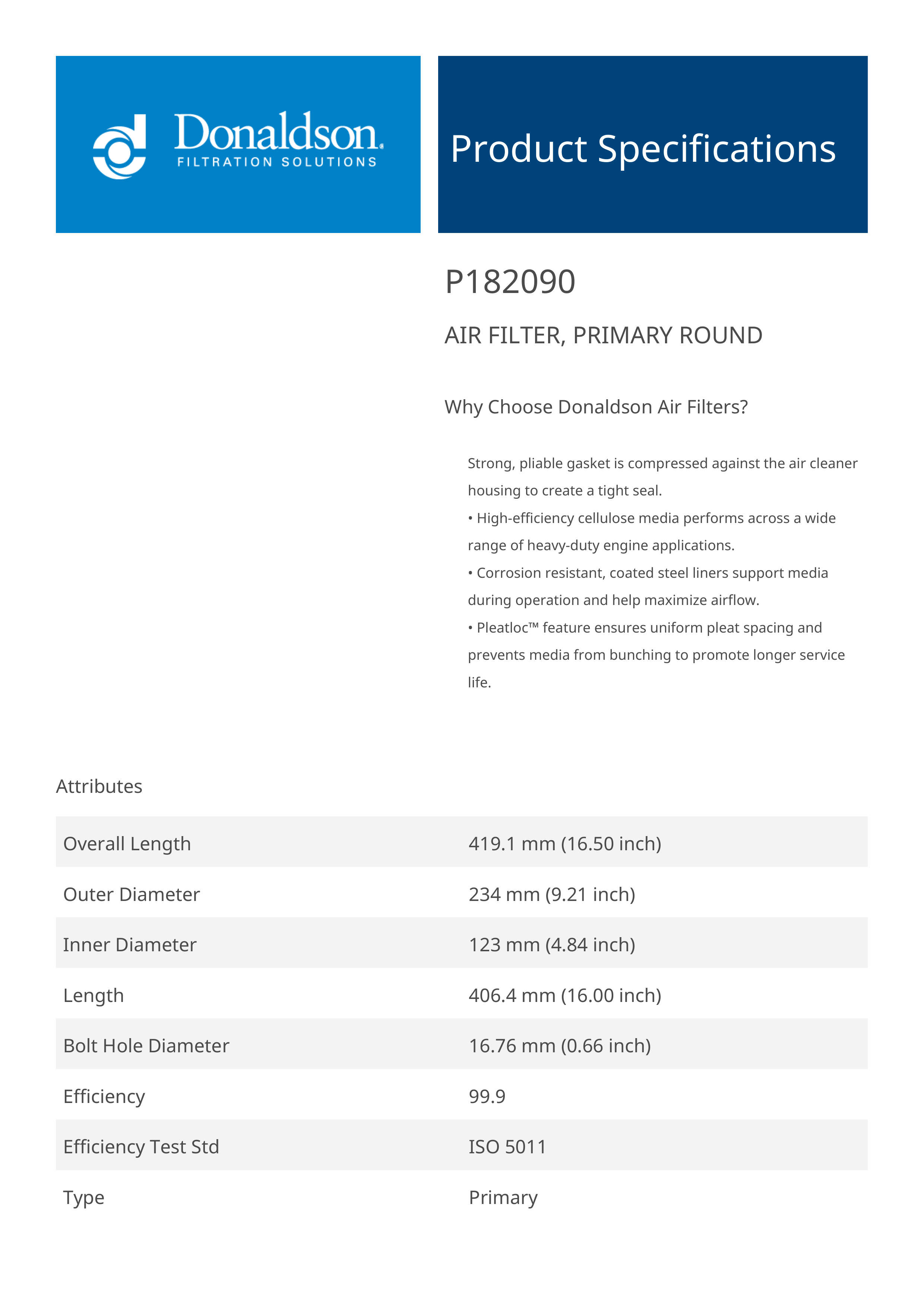 Genuine Donaldson P182090 Air Primary, Round provides clean, efficient airflow for engines by trapping airborne contaminants. Its round design maximizes filtration surface area while maintaining high airflow rates.Perfect for heavy-duty applications, this air primary filter enhances engine longevity and supports consistent performance.