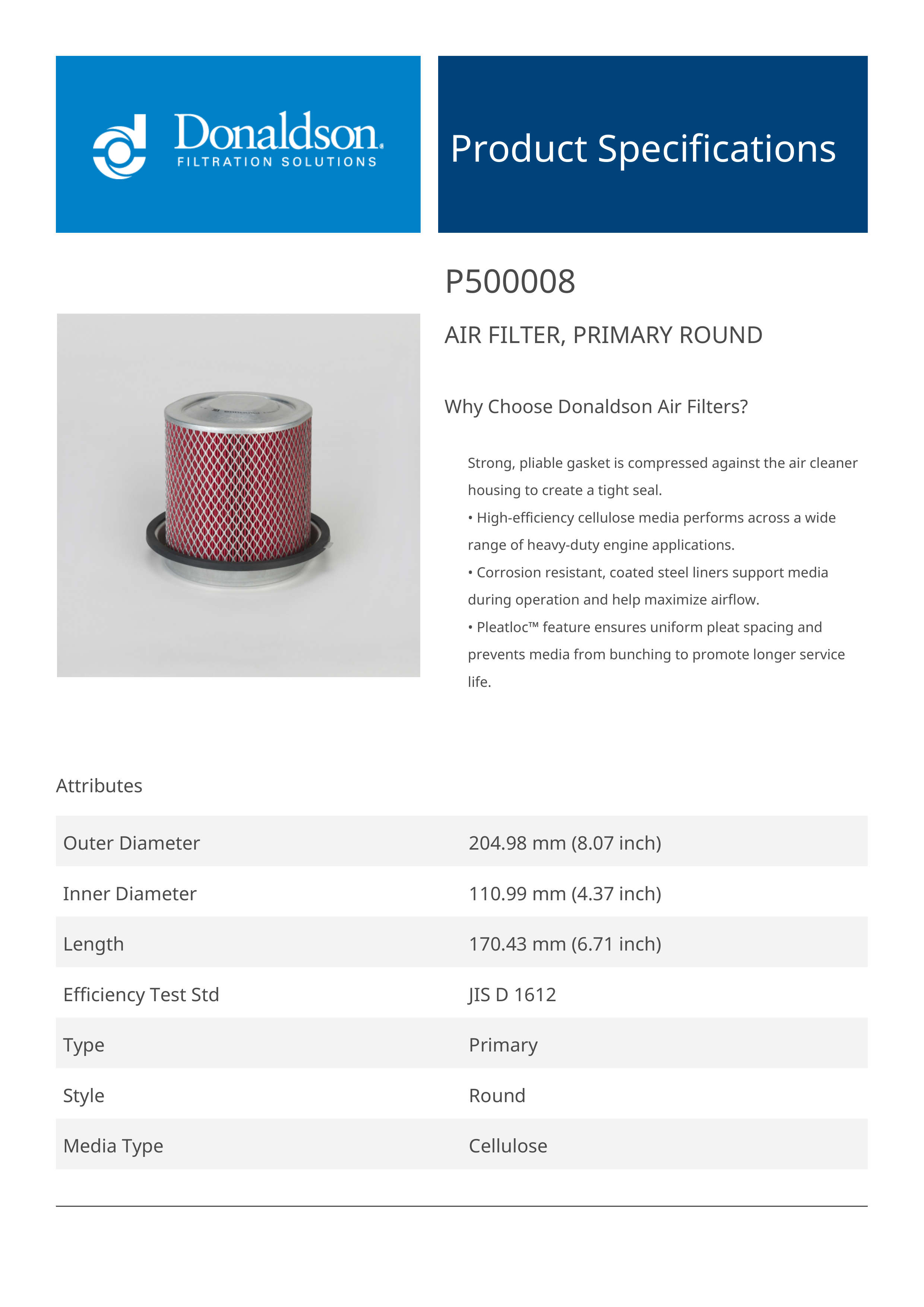 Genuine Donaldson P500008 Air Primary, Round provides clean, efficient airflow for engines by trapping airborne contaminants. Its round design maximizes filtration surface area while maintaining high airflow rates.Perfect for heavy-duty applications, this air primary filter enhances engine longevity and supports consistent performance.