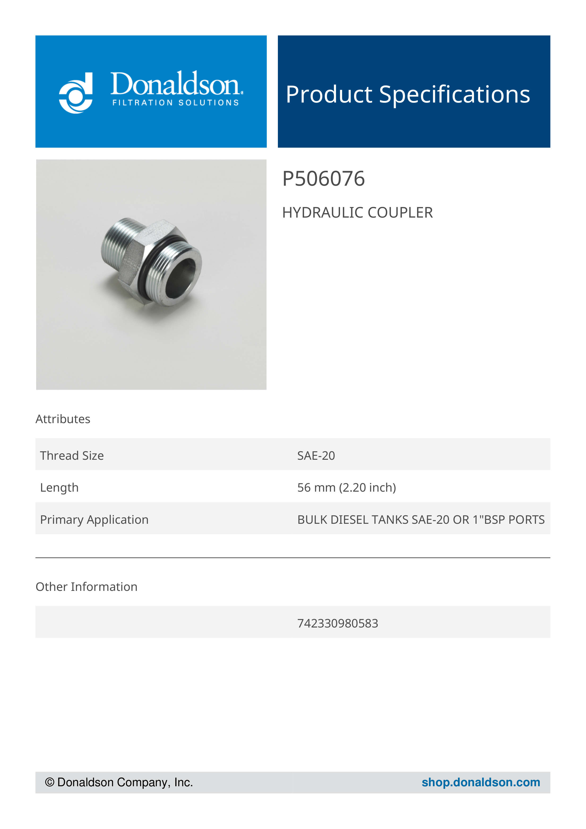 Donaldson P506076 Replacement Clean Solutions Hydraulic Coupler