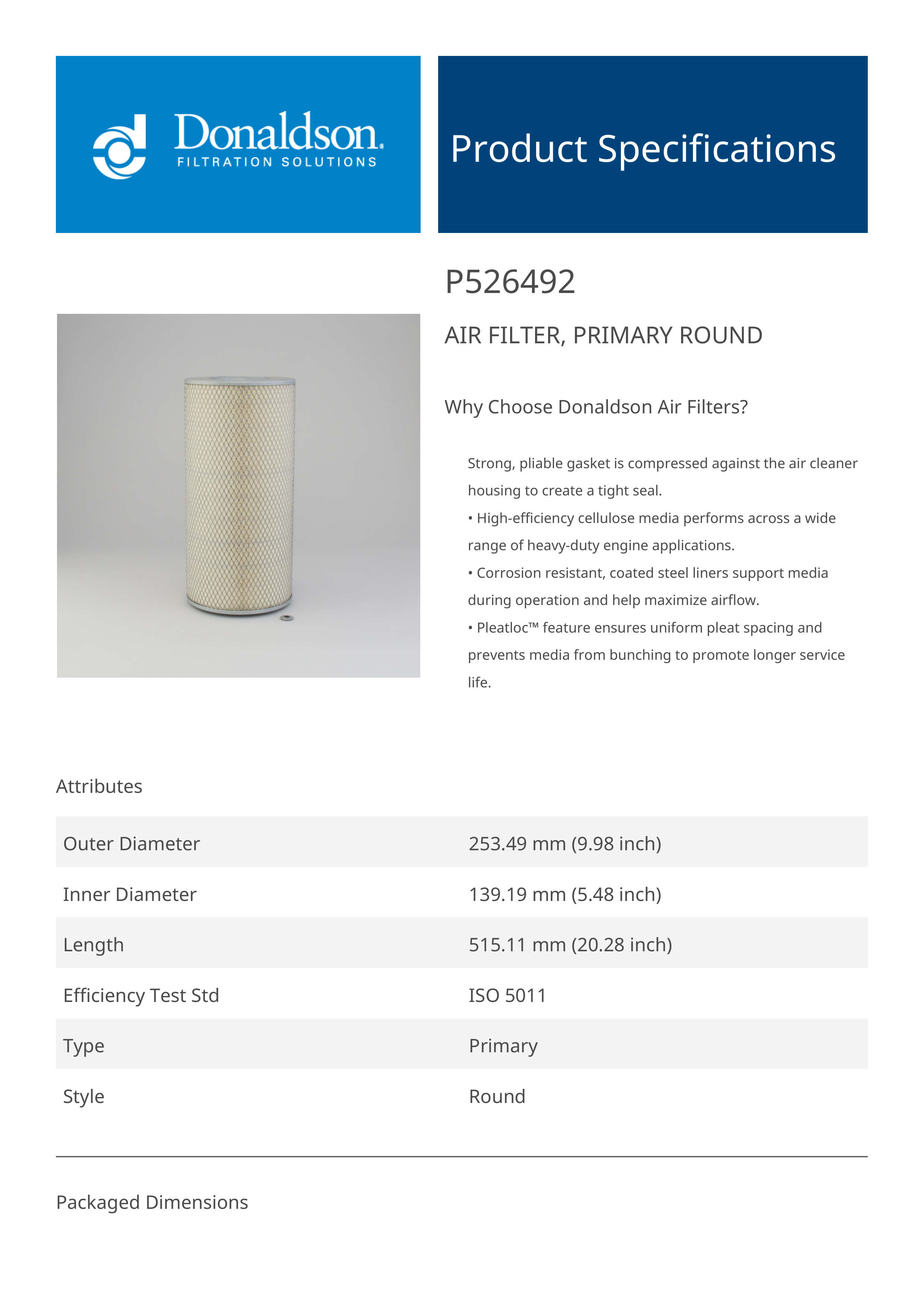 Genuine Donaldson P526492 Air Primary, Round provides clean, efficient airflow for engines by trapping airborne contaminants. Its round design maximizes filtration surface area while maintaining high airflow rates.Perfect for heavy-duty applications, this air primary filter enhances engine longevity and supports consistent performance.