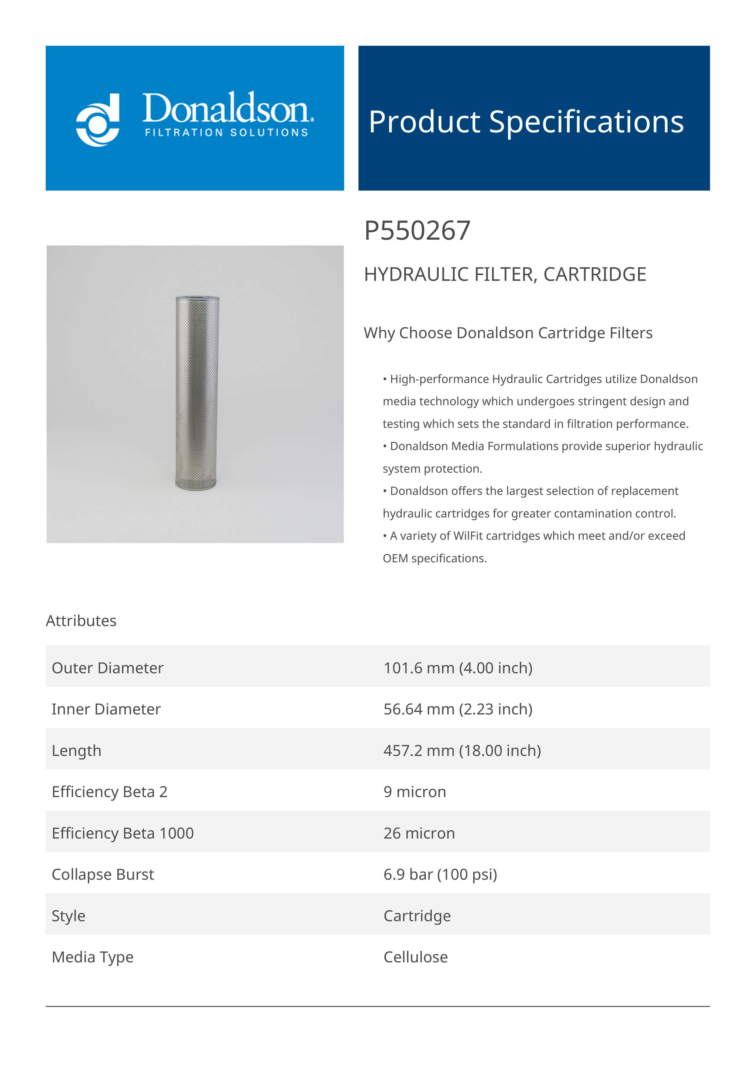 Genuine Donaldson P550267 Hydraulic Cartridge offers superior filtration performance, effectively removing contaminants from hydraulic fluids. Its high-capacity design helps maintain fluid cleanliness and system efficiency.