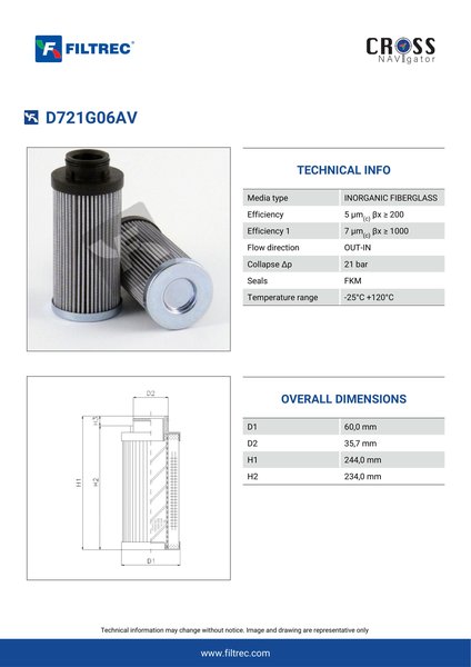 Genuine Filtrec D721G06AV. This Filtrec element is designed to meet or exceed the quality and performance of brand OEM’s ensuring superior filtration performance and long-lasting durability.
