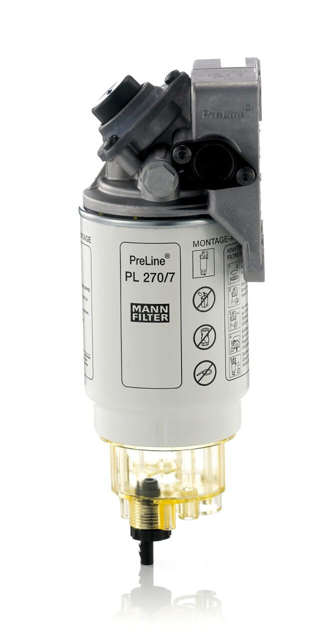 The MANN-FILTER PreLine system for simple and reliable retrofitting of an additional pre-filter with water separation for commercial vehicles. The retrofit system efficiently separates water contained in the fuel and thus protects the injection system from possible damage.