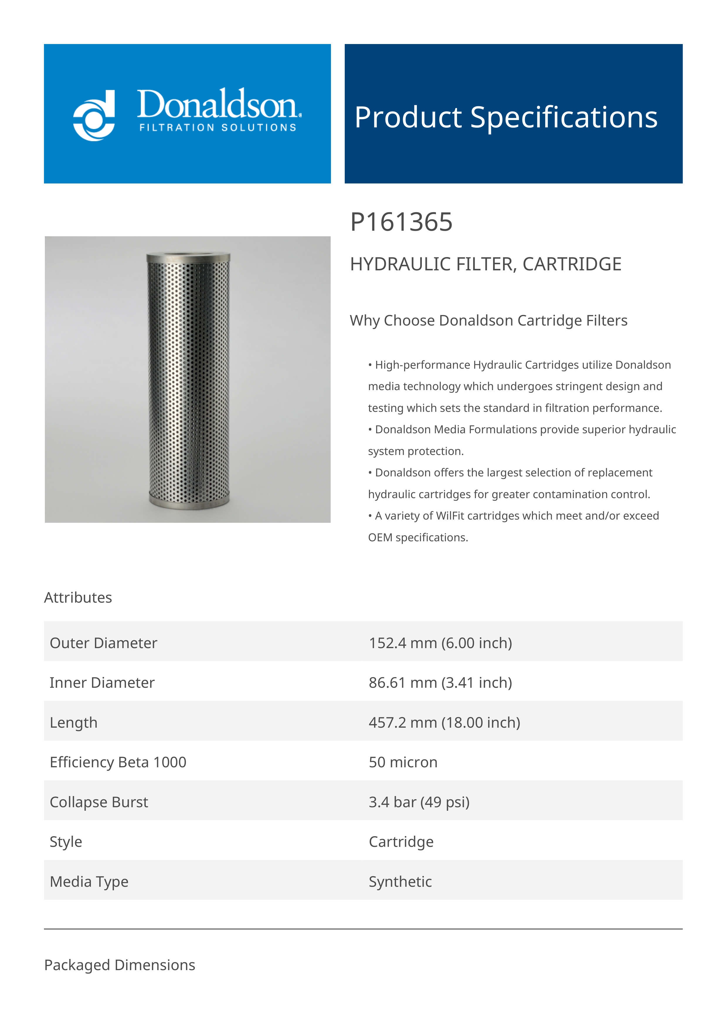Genuine Donaldson P161365 Hydraulic Filter, Cartridge is designed to provide superior protection for your hydraulic system, effectively capturing contaminants to ensure clean fluid circulation. With high-quality filtration media, it extends equipment life, improves operational efficiency, and maintains fluid cleanliness even in the most demanding environments.