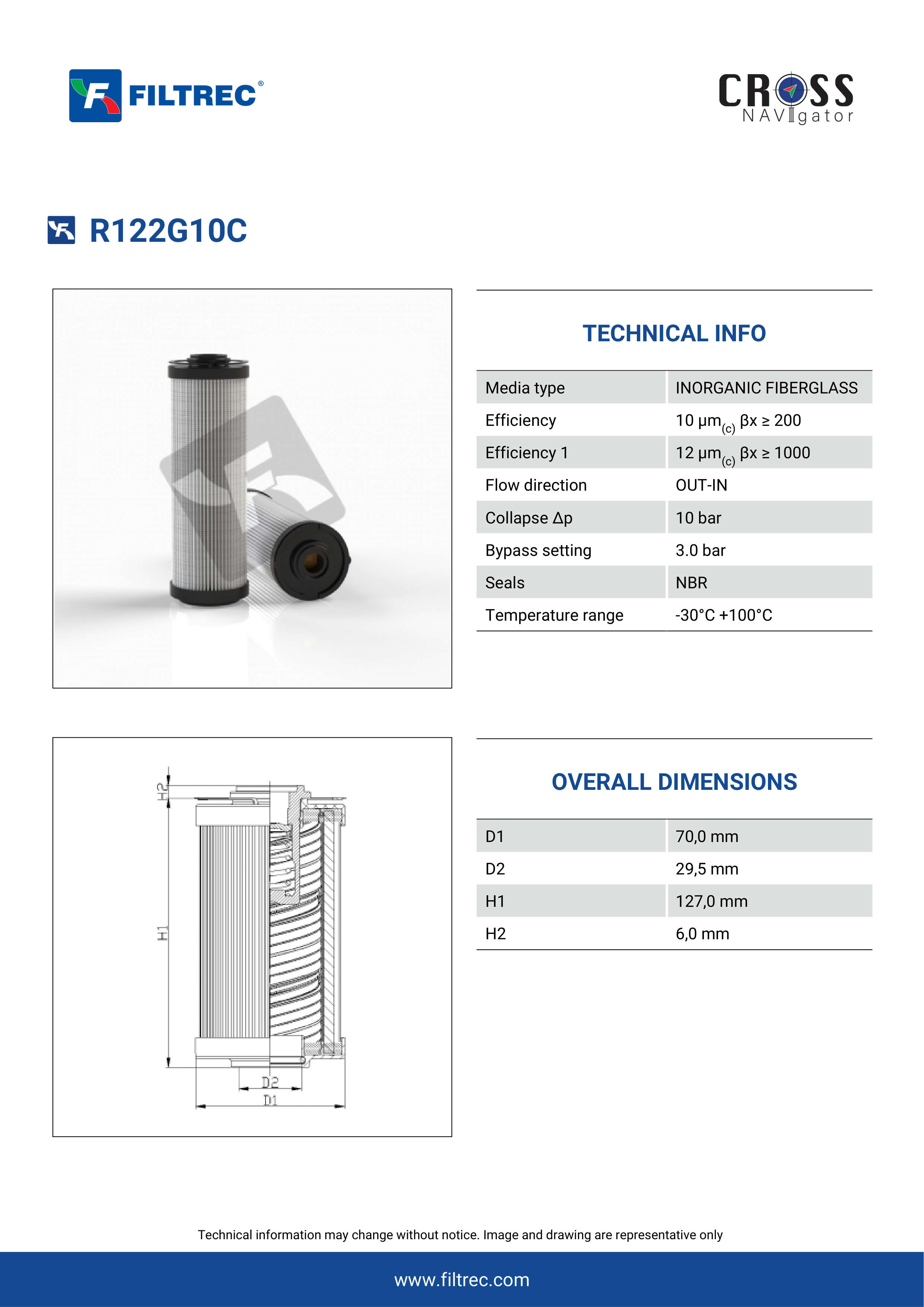 The efficiency of the element is shown using the Micron (µ) and Beta (β) ratings. The micron rating indicates the size of the particle being filtered and the beta rating the efficiency, calculated as 1/β.
