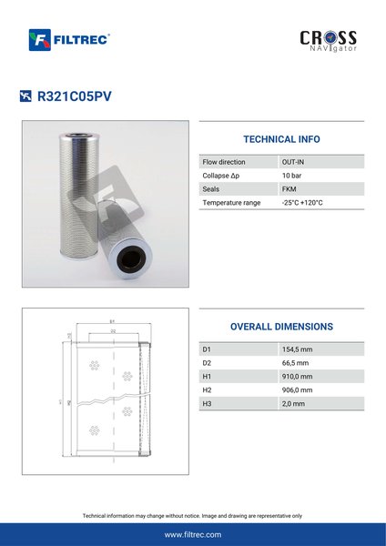 Engineered with their high performance media and a durable design, the R321C05PV provides reliable and consistent performance over its lifespan, even in harsh operating environments. When you order from FilterFinder, you can trust that you are getting a reliable and high-quality replacement filter that will keep your system running smoothly.