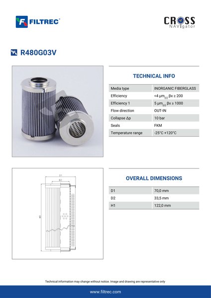 The efficiency of the element is shown using the Micron (µ) and Beta (β) ratings. The micron rating indicates the size of the particle being filtered and the beta rating the efficiency, calculated as 1/β.