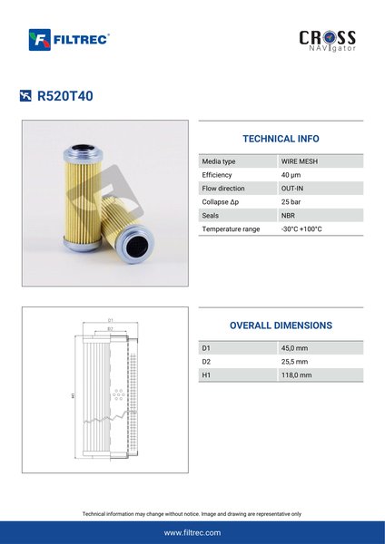 Genuine Filtrec R520T40. This Filtrec element is designed to meet or exceed the quality and performance of brand OEM’s ensuring superior filtration performance and long-lasting durability.