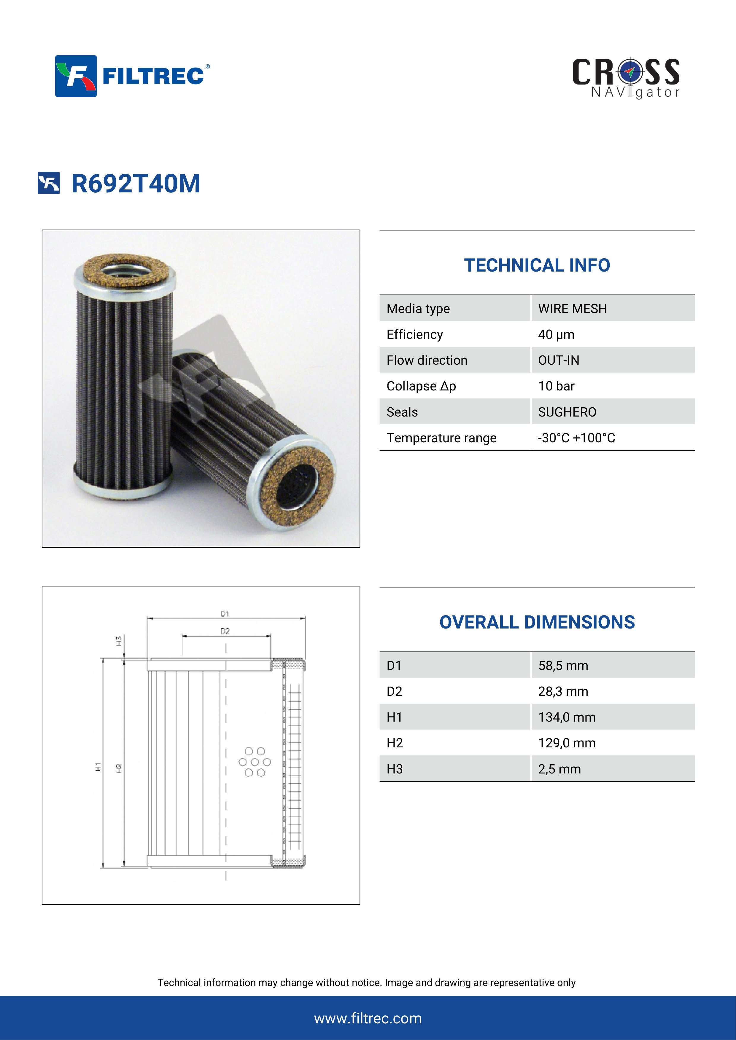Genuine Filtrec R692T40M. This Filtrec element is designed to meet or exceed the quality and performance of brand OEM’s ensuring superior filtration performance and long-lasting durability.