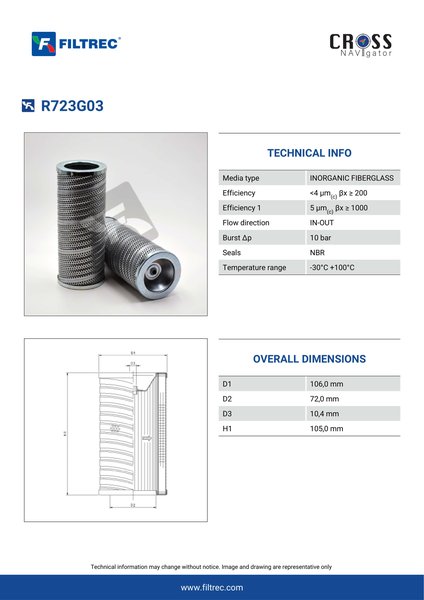 Genuine Filtrec R723G03. This Filtrec element is designed to meet or exceed the quality and performance of brand OEM’s ensuring superior filtration performance and long-lasting durability.