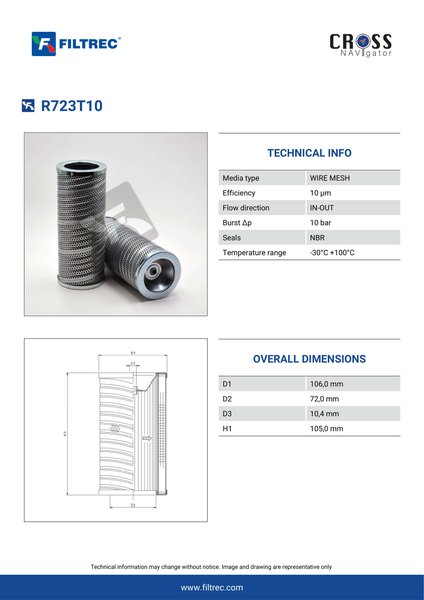 Genuine Filtrec R723T10. This Filtrec element is designed to meet or exceed the quality and performance of brand OEM’s ensuring superior filtration performance and long-lasting durability.