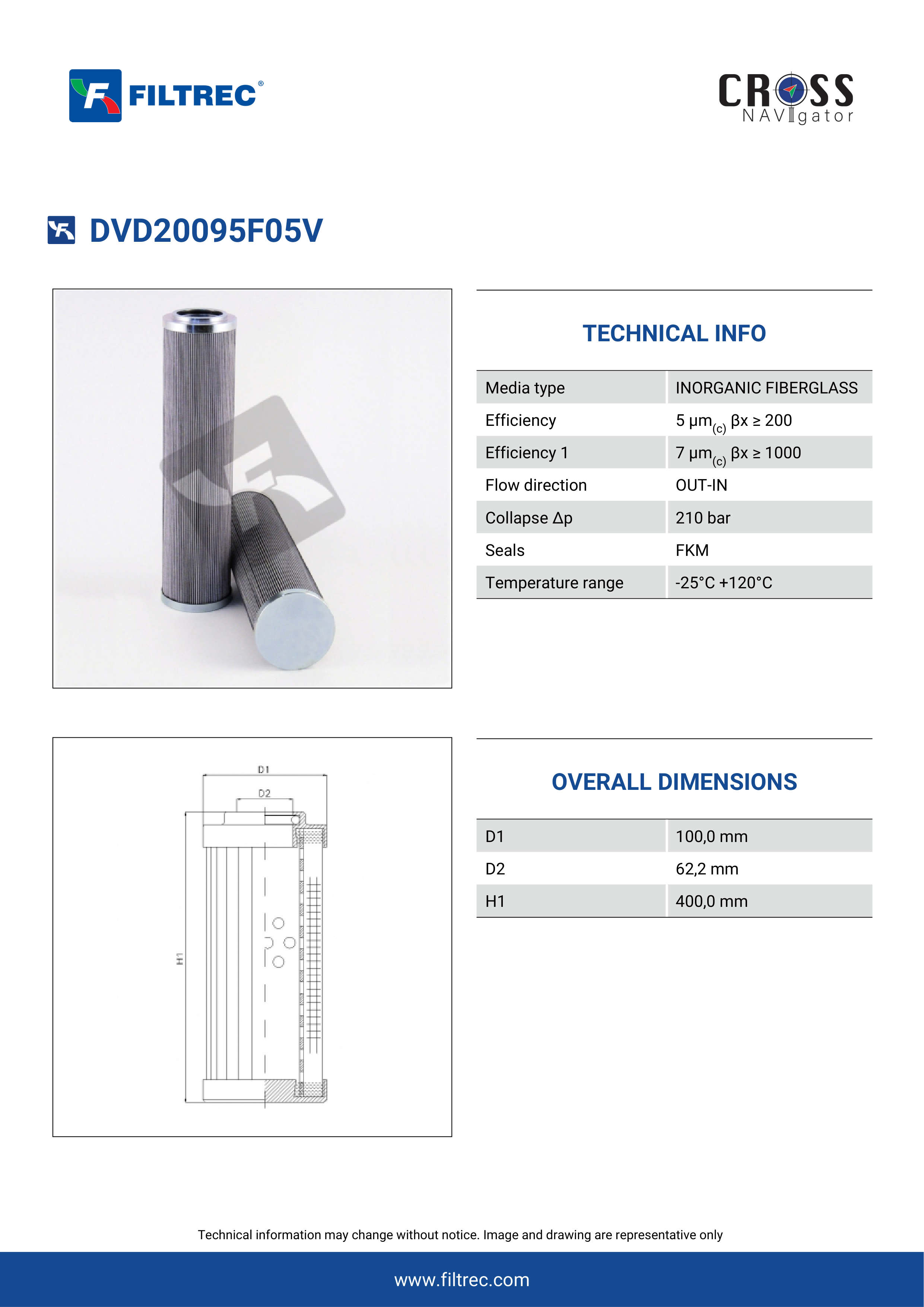 Genuine Filtrec DVD20095F05V. This Filtrec element is designed to meet or exceed the quality and performance of brand OEM’s ensuring superior filtration performance and long-lasting durability.Engineered with their high performance media and a durable design, the DVD20095F05V provides reliable and consistent performance over its lifespan, even in harsh operating environments. When you order from FilterFinder, you can trust that you are getting a reliable and high-quality replacement filter that will keep your system running smoothly.