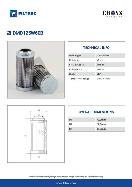 Genuine Filtrec DMD125W60B. This Filtrec element is designed to meet or exceed the quality and performance of brand OEM’s ensuring superior filtration performance and long-lasting durability.