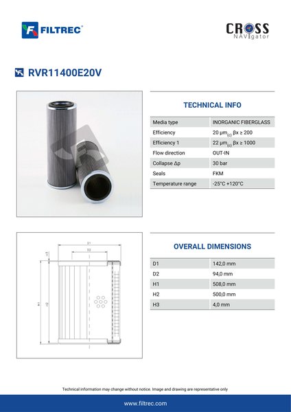 Genuine Filtrec RVR11400E20V. This Filtrec element is designed to meet or exceed the quality and performance of brand OEM’s ensuring superior filtration performance and long-lasting durability.Engineered with their high performance media and a durable design, the RVR11400E20V provides reliable and consistent performance over its lifespan, even in harsh operating environments. When you order from FilterFinder, you can trust that you are getting a reliable and high-quality replacement filter that will keep your system running smoothly.