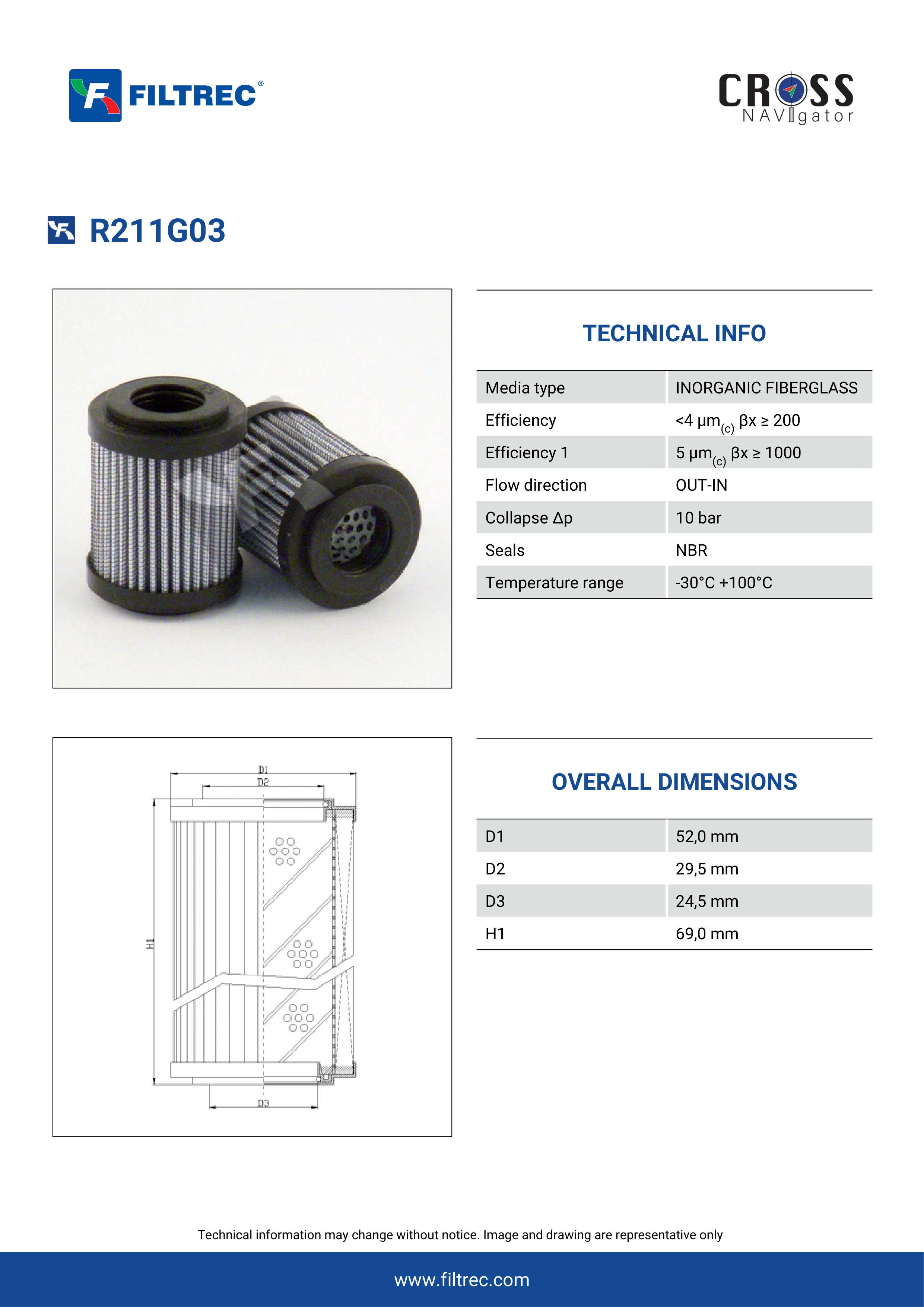 The efficiency of the element is shown using the Micron (µ) and Beta (β) ratings. The micron rating indicates the size of the particle being filtered and the beta rating the efficiency, calculated as 1/β.